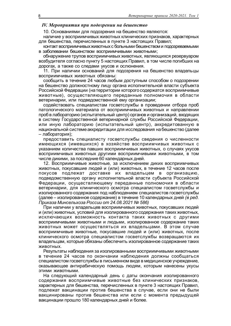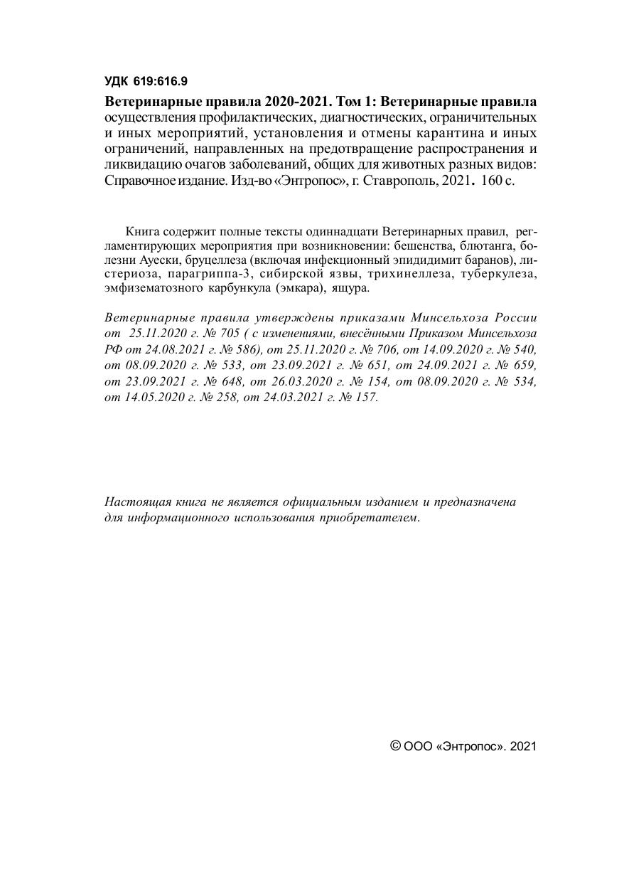 Ветеринарные правила 2020-2021. Том 1: Ветеринарные правила осуществления профилактических, диагностических, ограничительных и иных мероприятий, установления и отмены карантина и иных ограничений, направленных на предотвращение распространения и ликвидацию очагов заболеваний, общих для животных разных видов