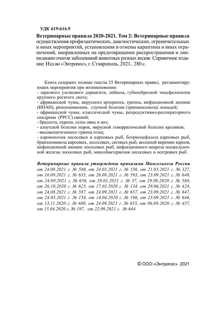 Ветеринарные правила 2020-2021. Том 2: Ветеринарные правила осуществления профилактических, диагностических, ограничительных и иных мероприятий, установления и отмены карантина и иных ограничений, направленных на предотвращение распространения и ликвидацию очагов заболеваний животных разных видов: