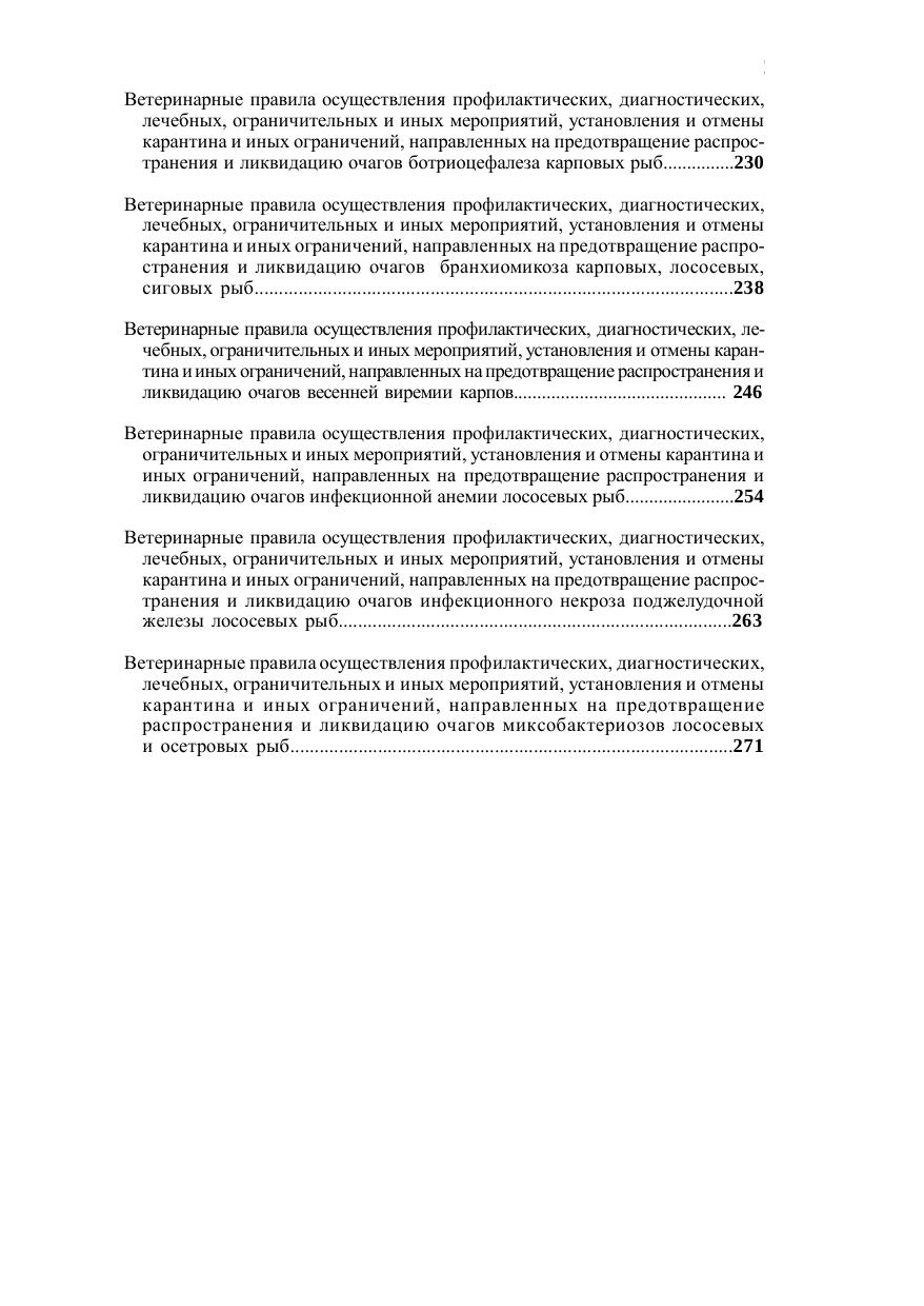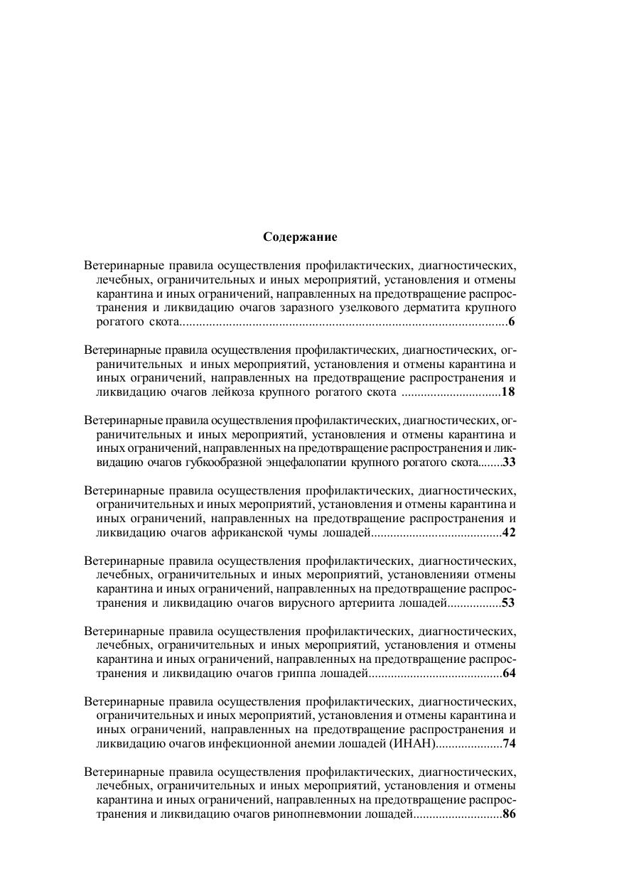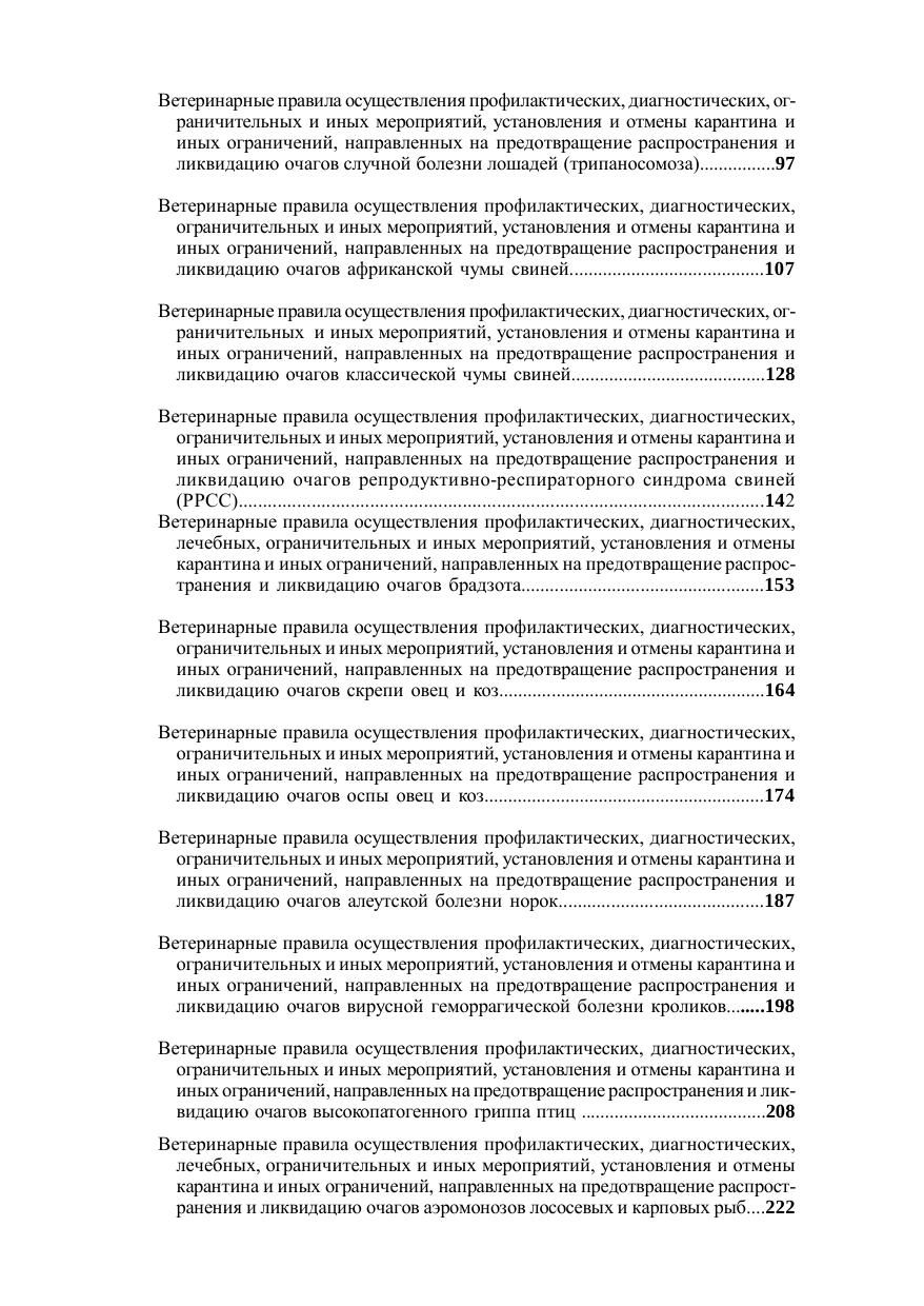 Книга содержит полные тексты 25 Ветеринарных правил, регламентирующих мероприятия при возникновении: - заразного узелкового дерматита, лейкоза, губкообразной энцефалопатии крупного рогатого скота; - африканской чумы, вирусного артериита, гриппа, инфекционной анемии (ИНАН), ринопневмонии, случной болезни (трипаносомоза) лошадей; - африканской чумы, классической чумы, репродуктивно-респираторного синдрома (РРСС) свиней; - брадзота, скрепи, оспы овец и коз; - алеутской болезни норок, вирусной геморрагической болезни кроликов; - высокопатогенного гриппа птиц; - аэромонозов лососевых и карповых рыб, ботриоцефалеза карповых рыб, бранхиомикоза карповых, лососевых, сиговых рыб, весенней виремии карпов, инфекционной анемии лососевых рыб, инфекционного некроза поджелудочной железы лососевых рыб, миксобактериозов лососевых и осетровых рыб.