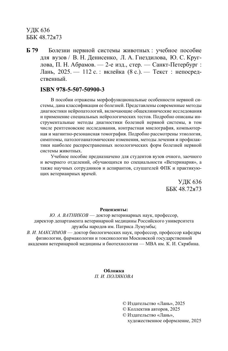 В пособии отражены морфофункциональные особенности нервной системы, дана классификация ее болезней. Представлены современные методы диагностики нейропатологий, включающие общеклинические исследования и применение специальных нейрологических тестов. Подробно описаны инструментальные методы диагностики болезней нервной системы, в том числе рентгеновские исследования, контрастная миелография, компьютерная и магнитнорезонансная томография. Подробно рассмотрены этиология, симптомы, патологоанатомические изменения, методы лечения и профилактики наиболее распространенных нозологических форм болезней нервной системы животных. Учебное пособие предназначено для студентов вузов очного, заочного и вечернего отделений, обучающихся по специальности «Ветеринария», а также научных сотрудников и аспирантов, слушателей ФПК и практикующих ветерианрных врачей.