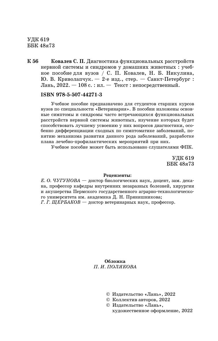 Учебное пособие предназначено для студентов старших курсов по специальности «Ветеринария». В пособии изложены основные симптомы и синдромы часто встречающихся функциональных расстройств нервной системы животных, изучение которых будет способствовать лучшему усвоению у них вопросов диагностики, особенно дифференциации сходных по симптоматике заболеваний, понятию механизма развития данного рода заболеваний, разработке плана лечебно-профилактических мероприятий при них.