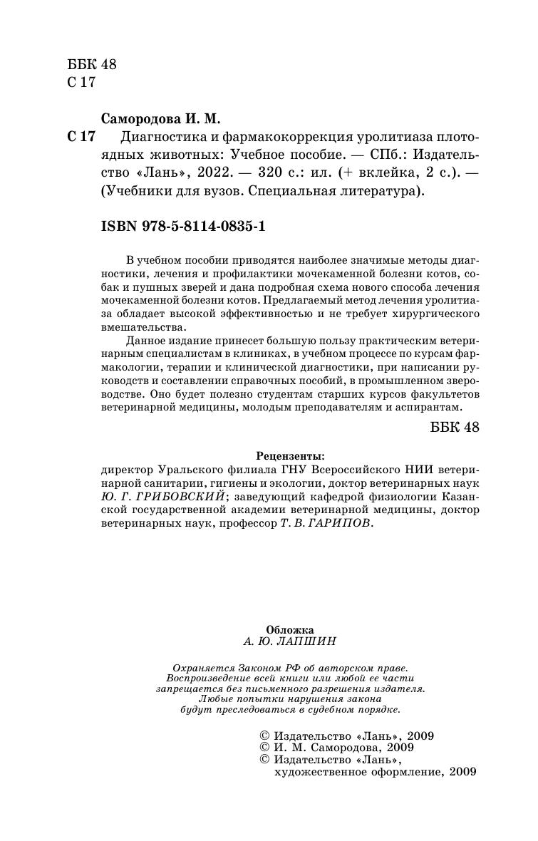 В учебном пособии приводятся наиболее значимые методы диагностики, лечения и профилактики мочекаменной болезни котов, собак и пушных зверей и дана подробная схема нового способа лечения мочекаменной болезни котов. Предлагаемый метод лечения уролитиаза обладает высокой эффективностью и не требует хирургического вмешательства. Данное издание принесет большую пользу практическим ветеринарным специалистам в клиниках, в учебном процессе по курсам фармакологии, терапии и клинической диагностики, при написании руководств и составлении справочных пособий, в промышленном звероводстве. Оно будет полезно студентам старших курсов факультетов ветеринарной медицины, молодым преподавателям и аспирантам.