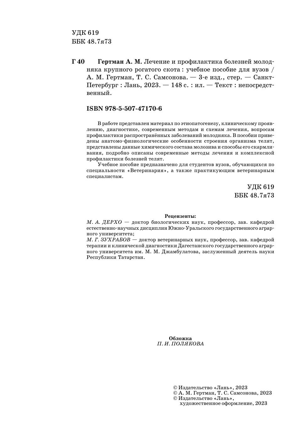 В работе представлен материал по этиопатогенезу, клиническому проявлению, диагностике, современным методам и схемам лечения, вопросам профилактики распространённых заболеваний молодняка. В пособии приведены анатомо-физиологические особенности строения организма телят, представлены данные химического состава молозива и способы его скармливания, подробно описаны современные методы лечения и комплексной профилактики болезней телят. Учебное пособие предназначено для студентов вузов, обучающихся по специальности «Ветеринария», а также практикующим ветеринарным специалистам.