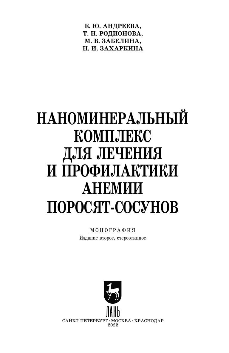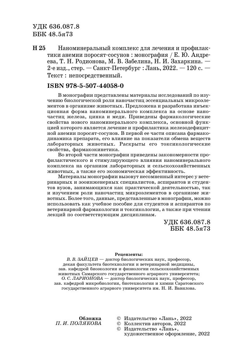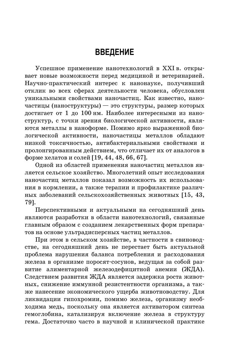 В монографии представлены материалы исследований по изучению биологической роли наночастиц эссенциальных микроэлементов в организме животных. Предложена и разработана инъекционная форма наноминерального комплекса на основе наночастиц железа, цинка и меди. Приведены фармакологические свойства нового наноминерального комплекса, основной функцией которого является лечение и профилактика железодефицитной анемии поросят-сосунов. В первой ее части описана фармакодинамика препарата, его влияние на показатели обмена веществ лабораторных животных. Раскрыты его токсикологические свойства, фармакокинетика. Во второй части монографии приведены закономерности профилактического и стимулирующего влияния наноминерального комплекса на организм лабораторных и сельскохозяйственных животных, а также его экономическая эффективность. Материалы монографии вызовут несомненный интерес у ветеринарных и зооинженерных специалистов, аспирантов и студентов, занимающихся как практической деятельностью, так и изучением роли наночастиц микроэлементов в организме животных. Более того, данные, представленные в монографии, можно использовать как учебное пособие для студентов и аспирантов по ветеринарной фармакологии и токсикологии, а также при чтении лекций по соответствующим дисциплинам.