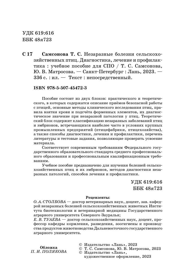 Пособие состоит из двух блоков: практического и теоретического, в которых содержатся описание приёмов безопасной работы с птицей, основные методы клинического исследования птиц, правила взятия крови и подсчёта форменных элементов, их диагностическое значение при незаразной патологии у птиц. Теоретический блок содержит классификацию незаразных заболеваний птиц и эмбрионов, встречающихся наиболее часто в условиях крупных промышленных предприятий (птицефабрики, птицехозяйства), а также способы диагностики, лечения и профилактики, перечень литературы и тестовые задания, позволяющие проверить усвоение материала. Соответствует современным требованиям Федерального государственного образовательного стандарта среднего профессионального образования и профессиональным квалификационным требованиям. Учебное пособие предназначено для изучения болезней сельскохозяйственных птиц и их эмбрионов, методов диагностики незаразных патологий, способов лечения и профилактики.