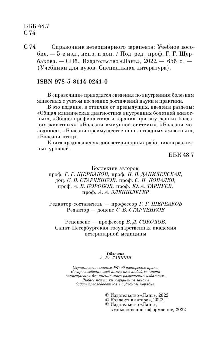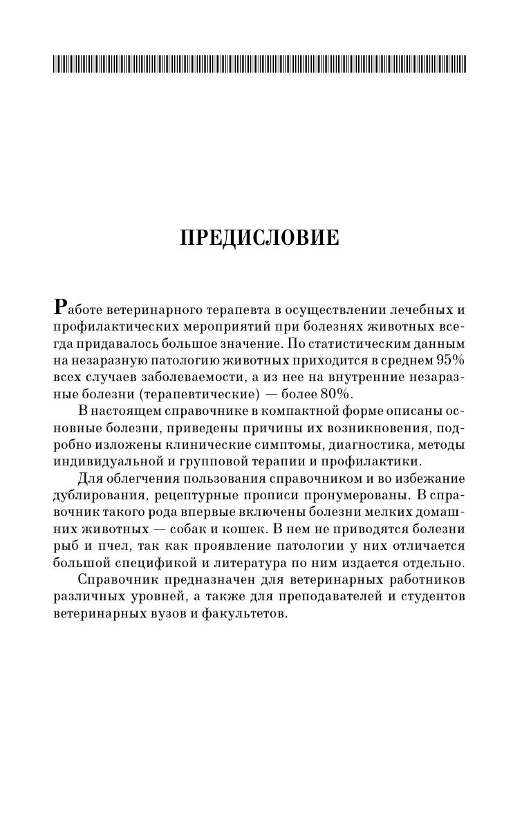 В справочнике приводятся сведения по внутренним болезням животных с учетом последних достижений науки и практики. В это издание, в отличие от предыдущих, введены разделы: «Общая клиническая диагностика внутренних болезней животных», «Общая профилактика и терапия при внутренних болезнях животных», «Болезни иммунной системы», «Болезни молодняка», «Болезни преимущественно плотоядных животных», «Болезни птиц». Книга предназначена для ветеринарных работников различных уровней.