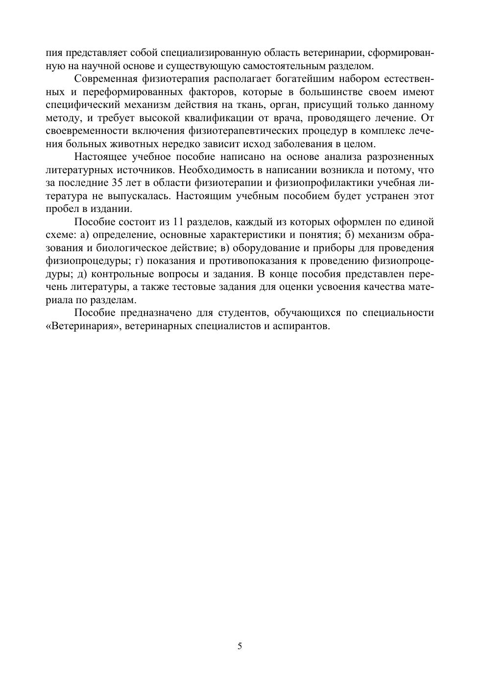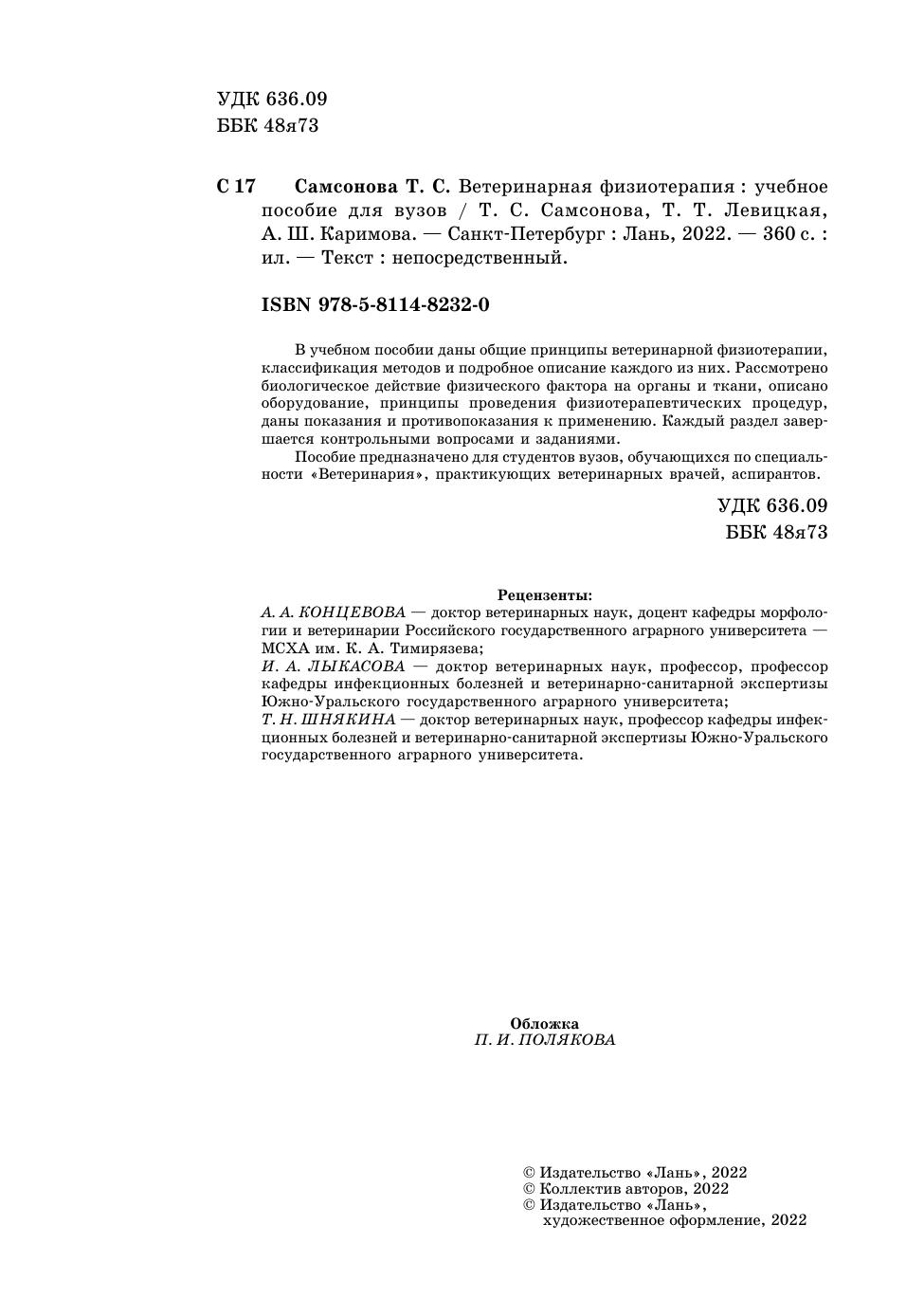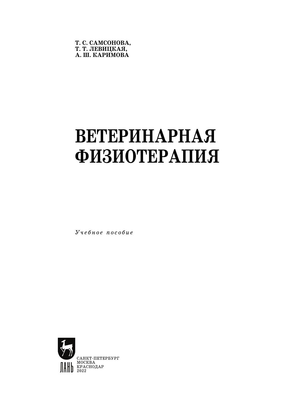 В учебном пособии даны общие принципы ветеринарной физиотерапии, классификация методов и подробное описание каждого из них. Рассмотрено биологическое действие физического фактора на органы и ткани, описано оборудование, принципы проведения физиотерапевтических процедур, даны показания и противопоказания к применению. Каждый раздел завершается контрольными вопросами и заданиям. Пособие предназначено для студентов, обучающихся по специальности «Ветеринария», практикующих ветеринарных врачей, аспирантов.