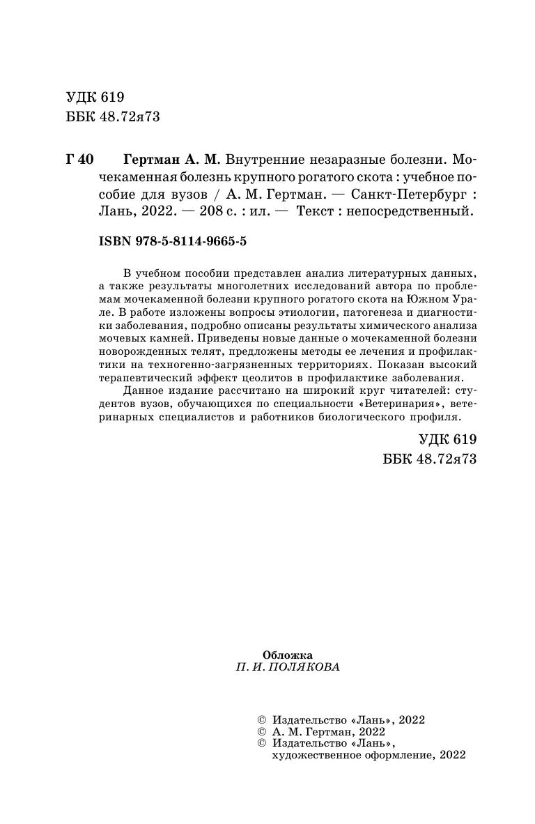 В учебном пособии представлен анализ литературных данных, а также результаты многолетних исследований автора по проблемам мочекаменной болезни крупного рогатого скота на Южном Урале. В работе изложены вопросы этиологии, патогенеза и диагностики заболевания, подробно описаны результаты химического анализа мочевых камней. Приведены новые данные о мочекаменной болезни новорождённых телят, предложены методы её лечения и профилактики на техногенно-загрязнённых территориях. Показан высокий терапевтический эффект цеолитов в профилактике заболевания. Данное издание рассчитано на широкий круг читателей: студентов, ветеринарных специалистов и работников биологического профиля.