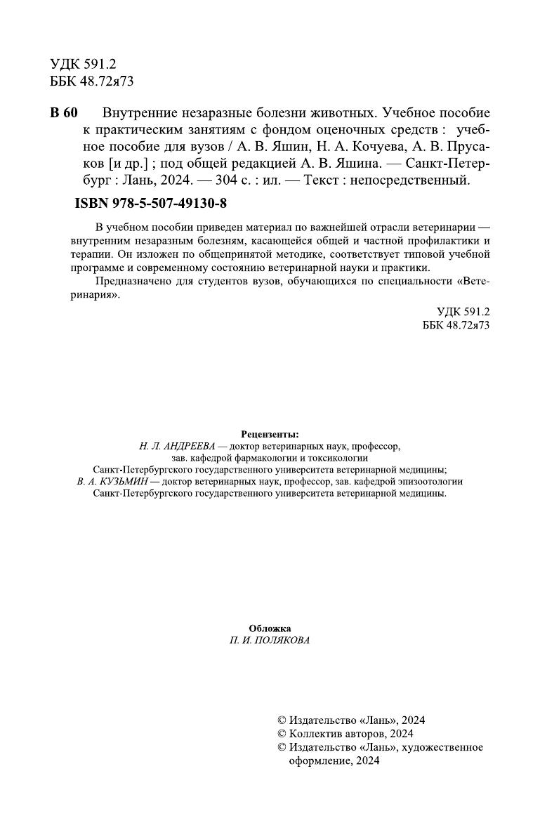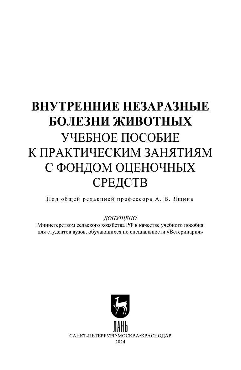 В учебном пособии приведен материал по важнейшей отрасли ветеринарии — внутренним незаразным болезням, касающейся общей и частной профилактики и терапии. Он изложен по общепринятой методике, соответствует типовой учебной программе и современному состоянию ветеринарной науки и практики. Предназначено для студентов вузов, обучающихся по специальности «Ветеринария».