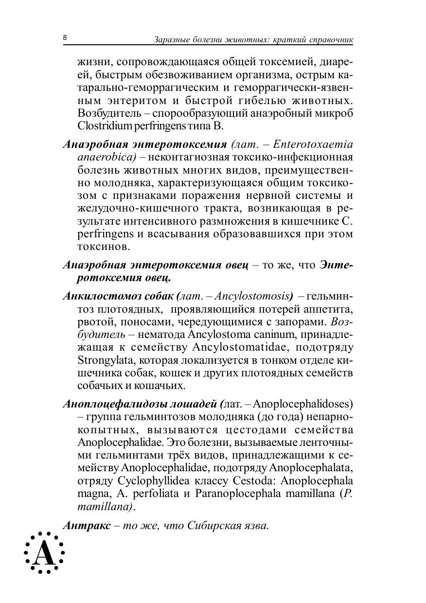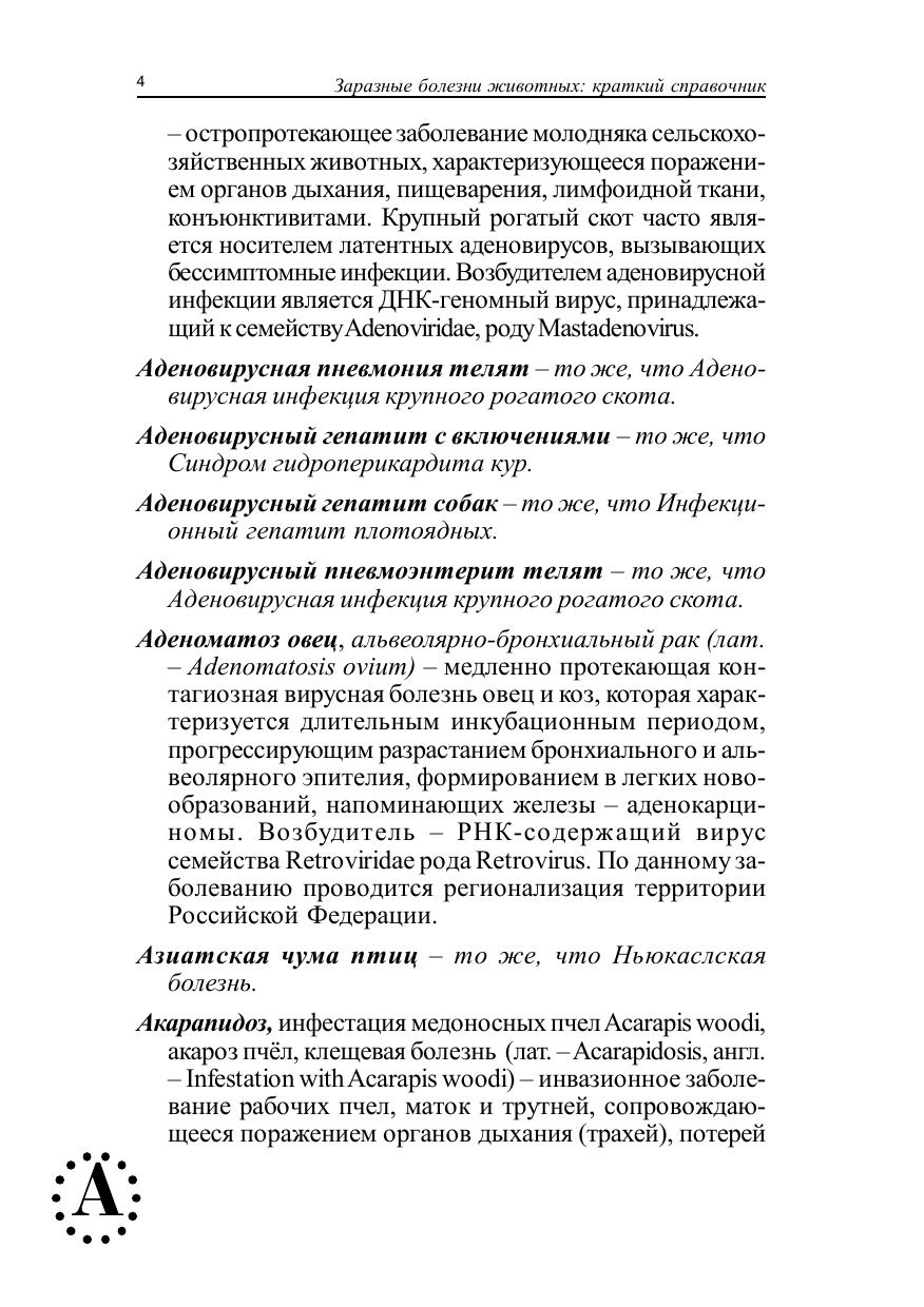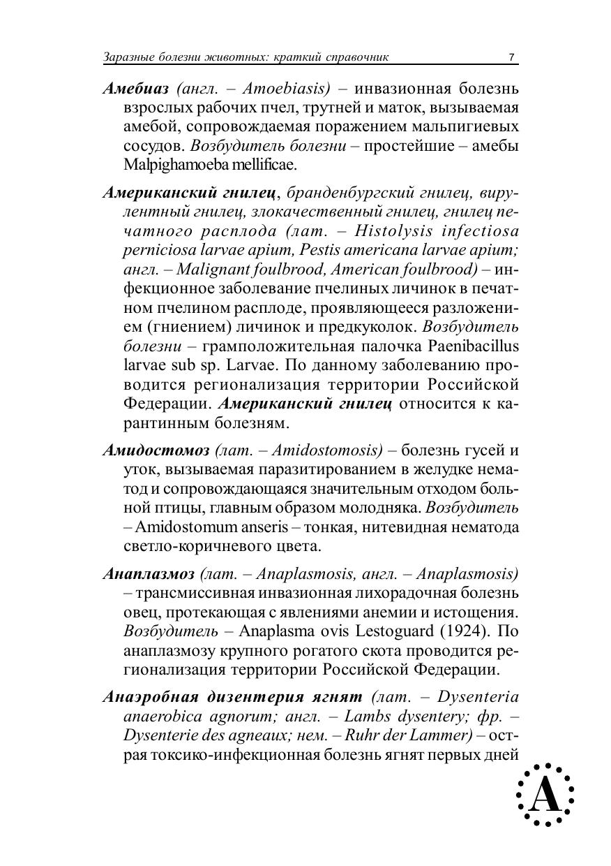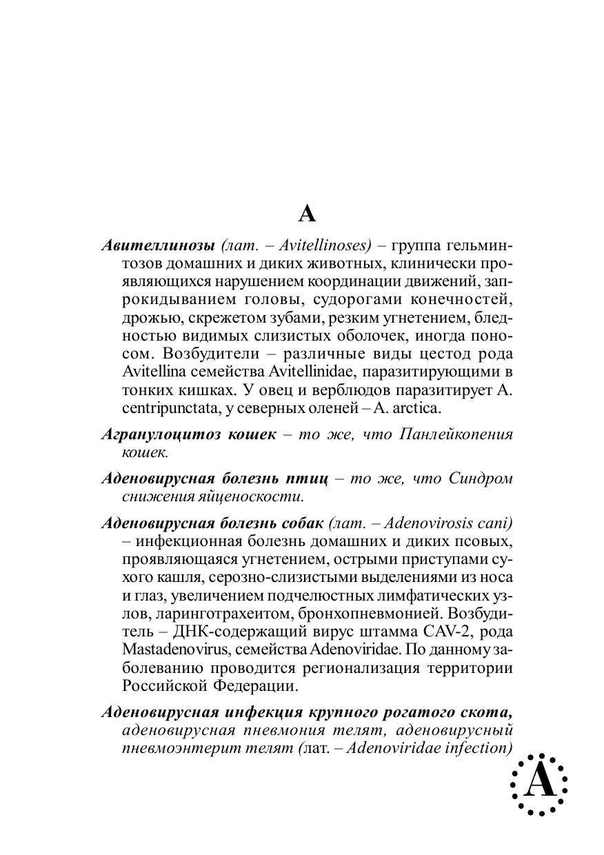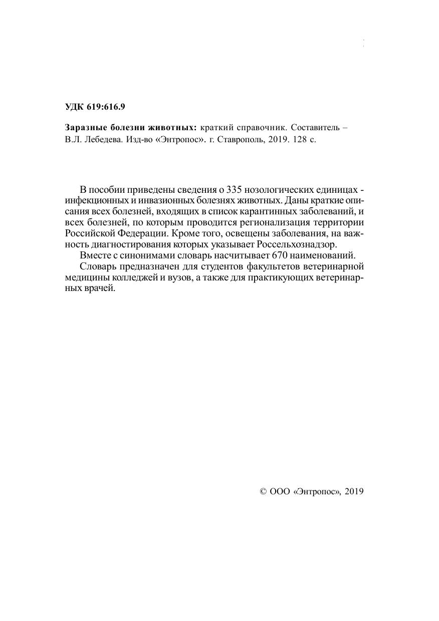 В пособии приведены сведения о 335 нозологических единицах - инфекционных и инвазионных болезнях животных. Даны краткие описания всех болезней, входящих в список карантинных заболеваний, и всех болезней, по которым проводится регионализация территории Российской Федерации. Кроме того, освещены заболевания, на важность диагностирования которых указывает Россельхознадзор. Вместе с синонимами словарь насчитывает 670 наименований. Словарь предназначен для студентов факультетов ветеринарной медицины колледжей и вузов, а также для практикующих ветеринарных врачей.