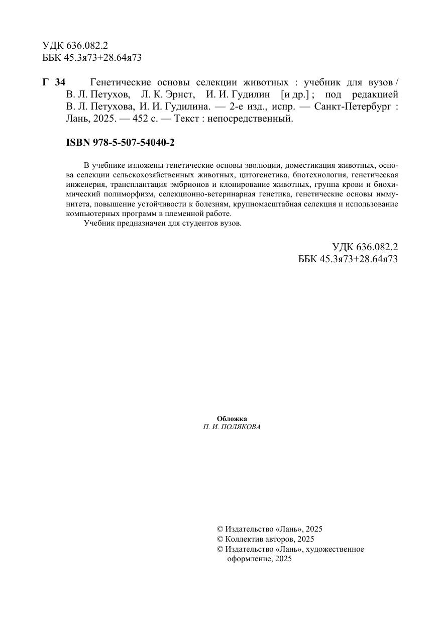 В учебнике изложены генетические основы эволюции, доместикация животных, основа селекции сельскохозяйственных животных, цитогенетика, биотехнология, генетическая инженерия, трансплантация эмбрионов и клонирование животных, группа крови и биохимический полиморфизм, селекционно-ветеринарная генетика, генетические основы иммунитета, повышение устойчивости к болезням, крупномасштабная селекция и использование компьютерных программ в племенной работе. Учебник предназначен для студентов вузов.