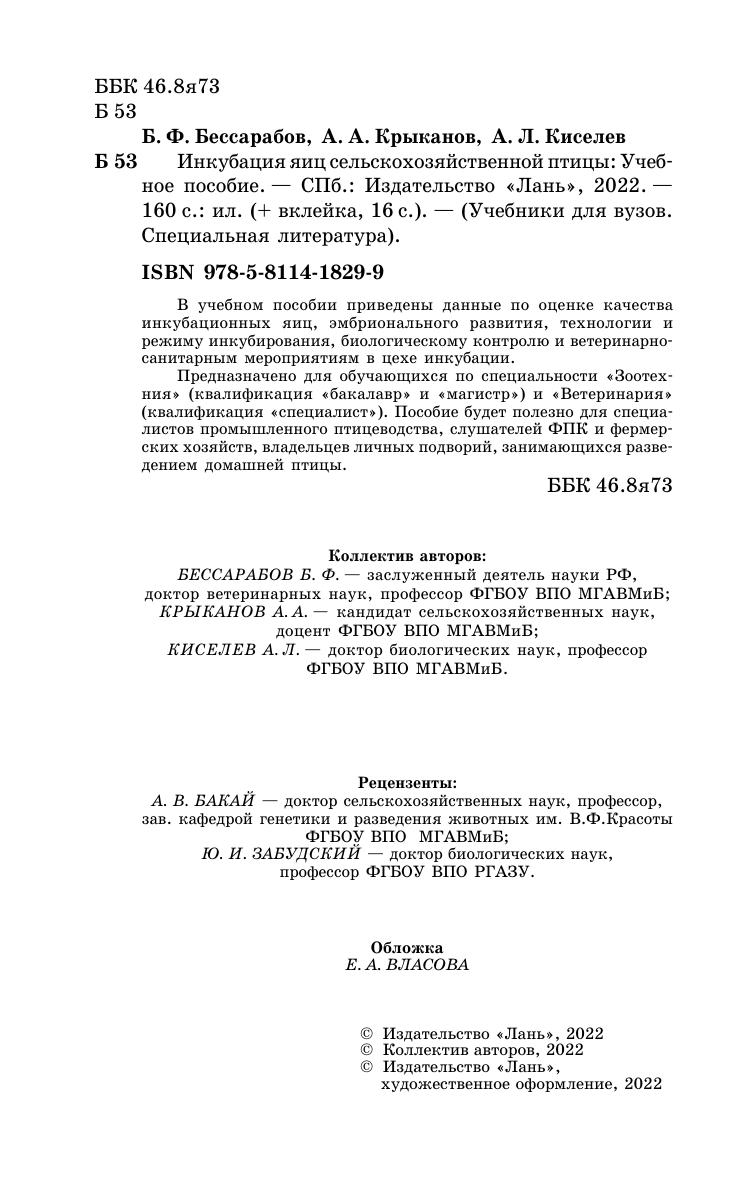 В учебном пособии приведены данные по оценке качества инкубационных яиц, эмбрионального развития, технологии и режиму инкубирования, биологическому контролю и ветеринарно-санитарным мероприятиям в цехе инкубации. Предназначено для обучающихся по специальности «Зоотехния» (квалификация «бакалавр» и «магистр») и «Ветеринария» (квалификация «специалист»). Пособие будет полезно для специалистов промышленного птицеводства, слушателей ФПК и фермерских хозяйств, владельцев личных подворий, занимающихся разведением домашней птицы.