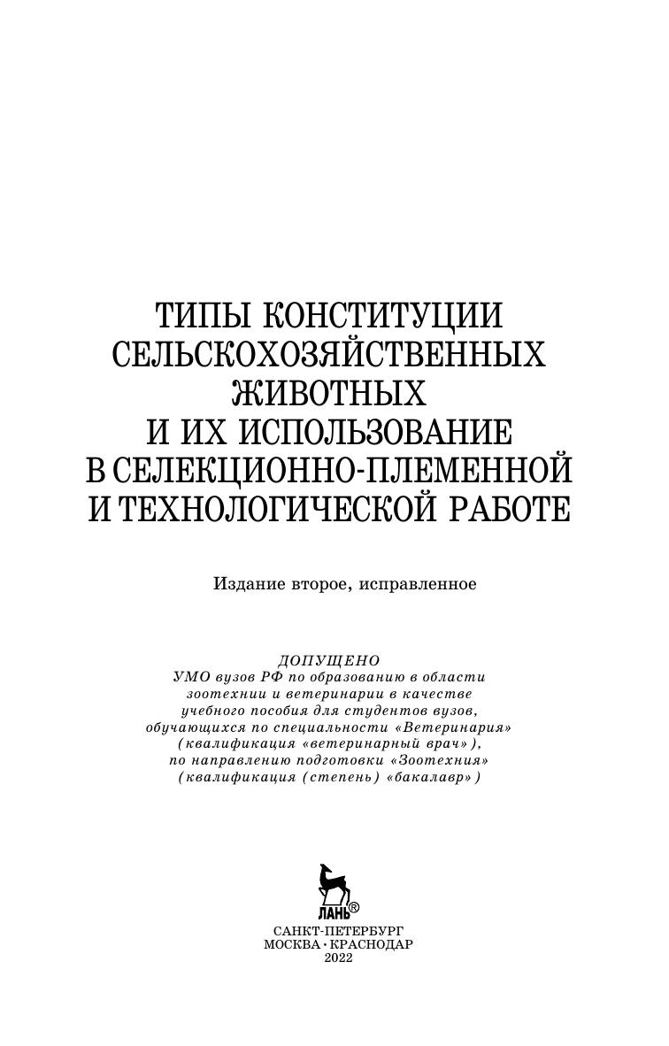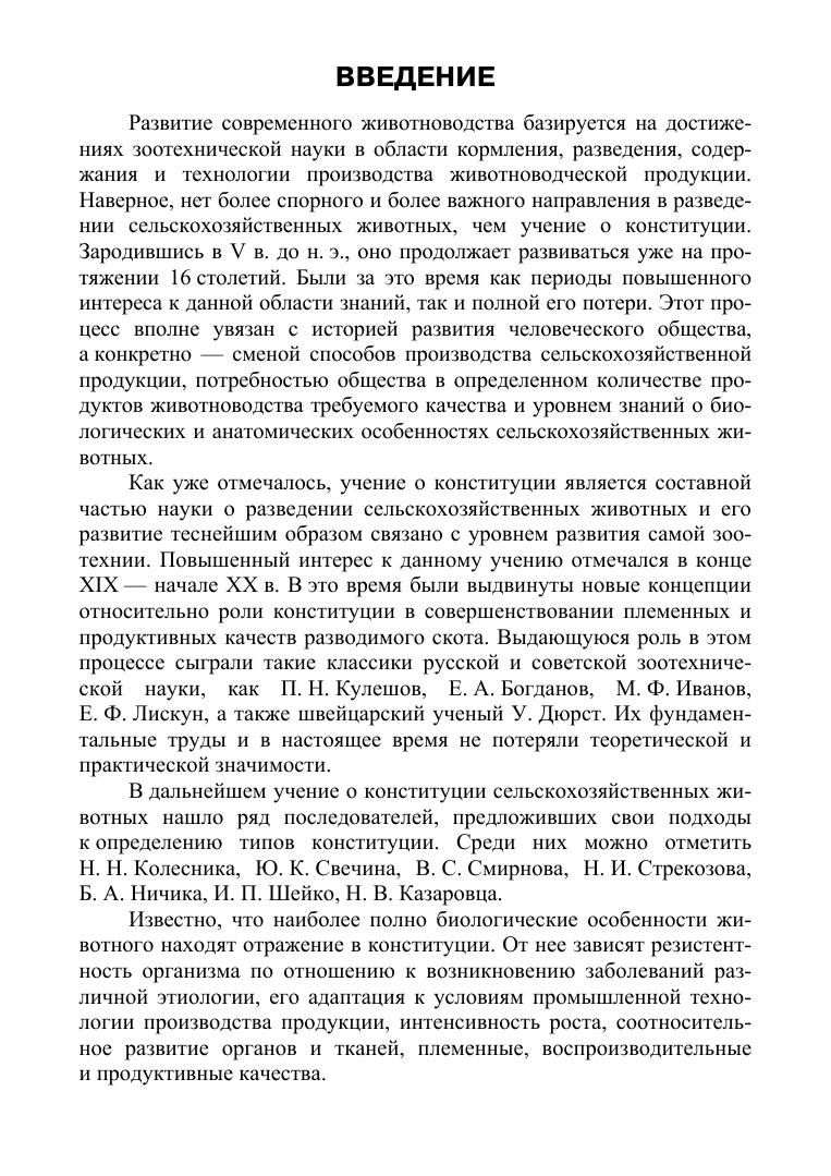 В учебном пособии представлены с комплексной точки зрения современные научно-методические данные о типах конституции сельскохозяйственных животных, об их значении и использовании в селекционно-племенной и технологической работе в племенном и товарном животноводстве. Описаны методы определение типов конституции, их взаимосвязь с уровнем и направлением продуктивности животных. Учебное пособие рассчитано на студентов, аспирантов, преподавателей по специальностям «Зоотехния» и «Ветеринария», а также специалистов — производственников по технологии производства молока, говядины, свинины и селекционеров в животноводстве, слушателей системы профессиональной переподготовки и повышения квалификации руководителей и специалистов АПК.