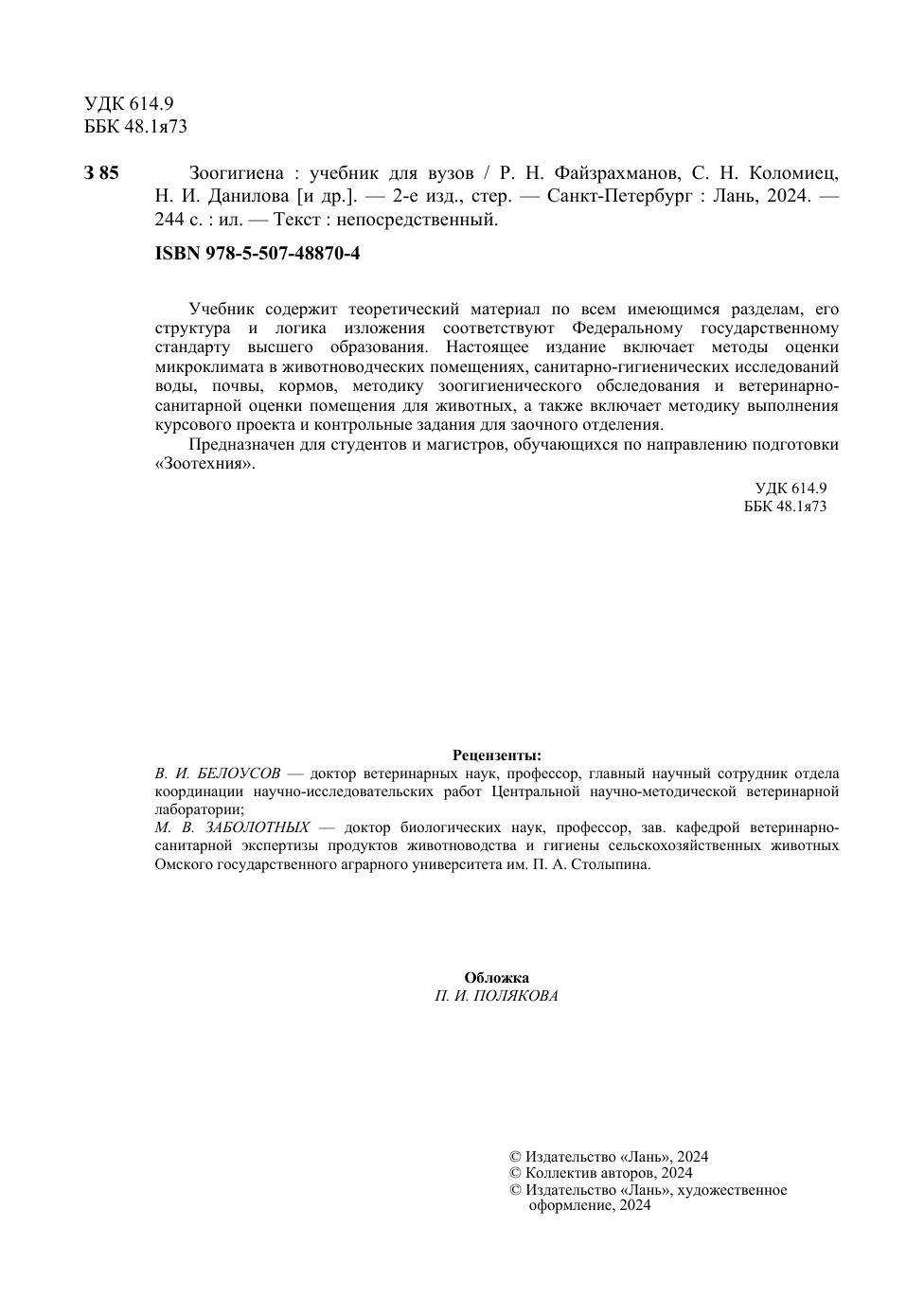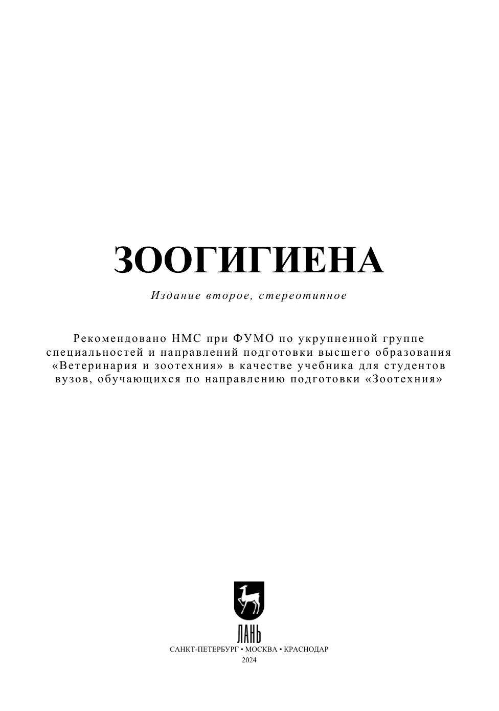 Учебник содержит теоретический материал по всем имеющимся разделам, его структура и логика изложения соответствуют федеральному государственному стандарту высшего образования. Настоящее издание включает методы оценки микроклимата в животноводческих помещениях, санитарно-гигиенических исследований воды, почвы, кормов, методику зоогигиенического обследования и ветеринарно-санитарной оценки помещения для животных, а также включает методику выполнения курсового проекта и контрольные задания для заочного отделения. Предназначен для студентов и магистров, обучающихся по направлению подготовки «Зоотехния».
