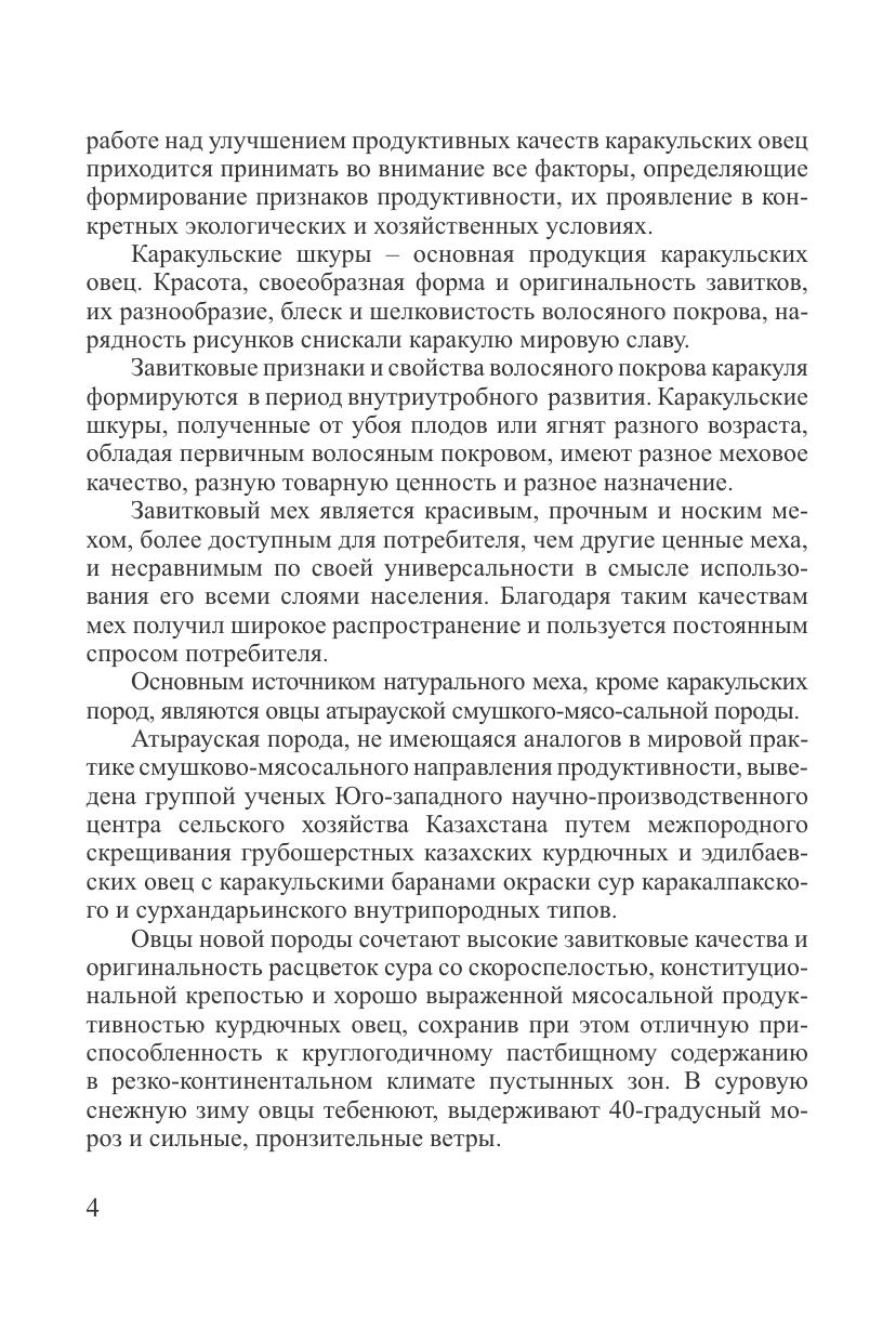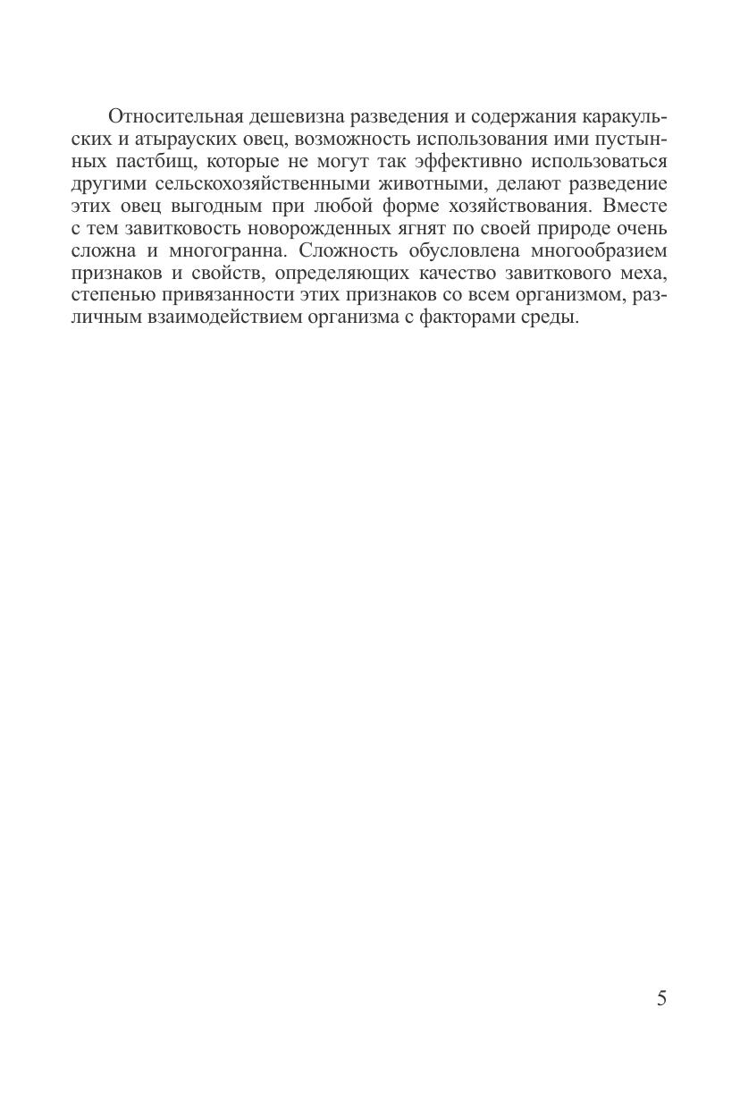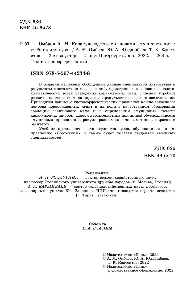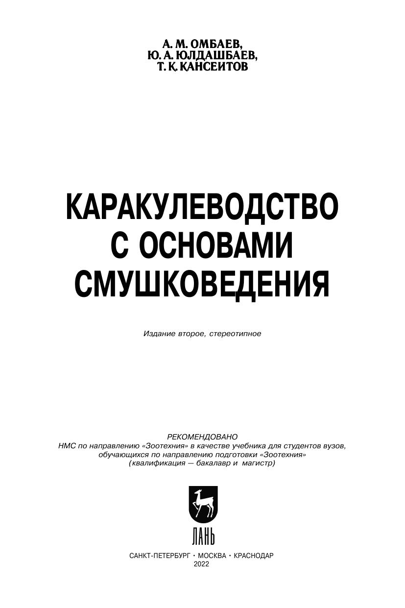 В издании изложены обобщенные данные специальной литературы и результаты многолетних исследований, проведенных в основных эколого-климатических зонах разведения каракульских овец. Описаны утробное развитие плода и генетика окрасок каракульских овец и их наследование. Приводятся данные о гистоморфологических признаках кожно-волосяного покрова новорожденных ягнят и их роли в качественном образовании градаций завиткового меха и в определении смушковых качеств каракульских шкурок. Дается характеристика причинной обусловленности смушковых признаков каракуля разных завитковых типов, окрасок и расцветок. Учебник предназначен для студентов, обучающихся по направлению «Зоотехния», а также будет полезен студентам смежных специальностей.