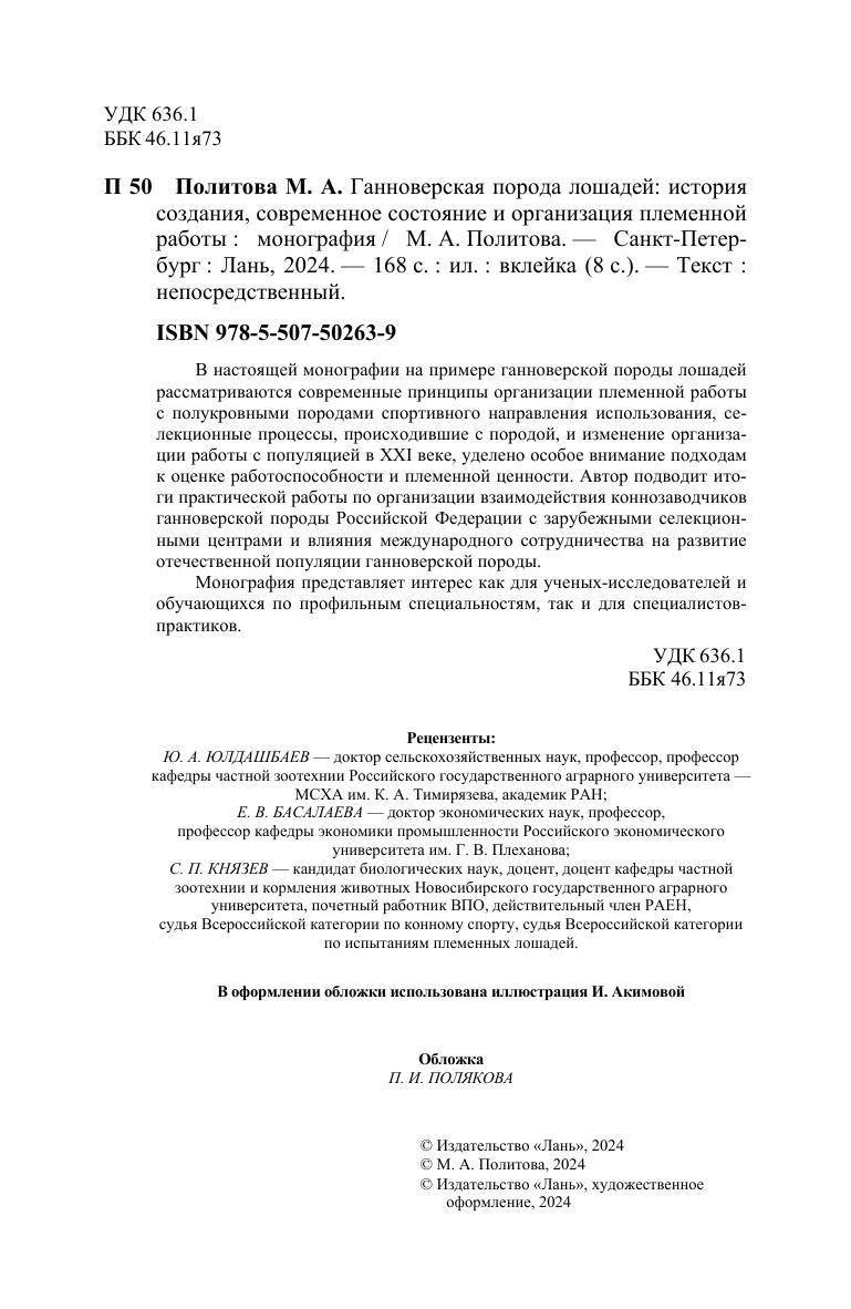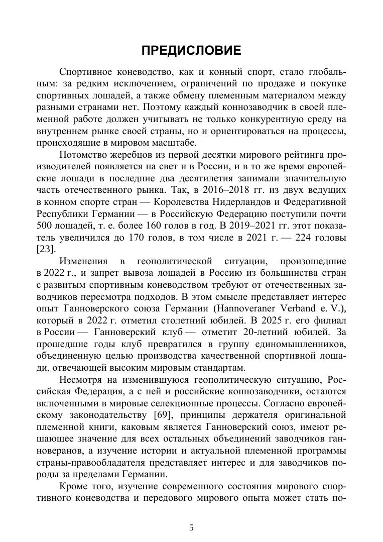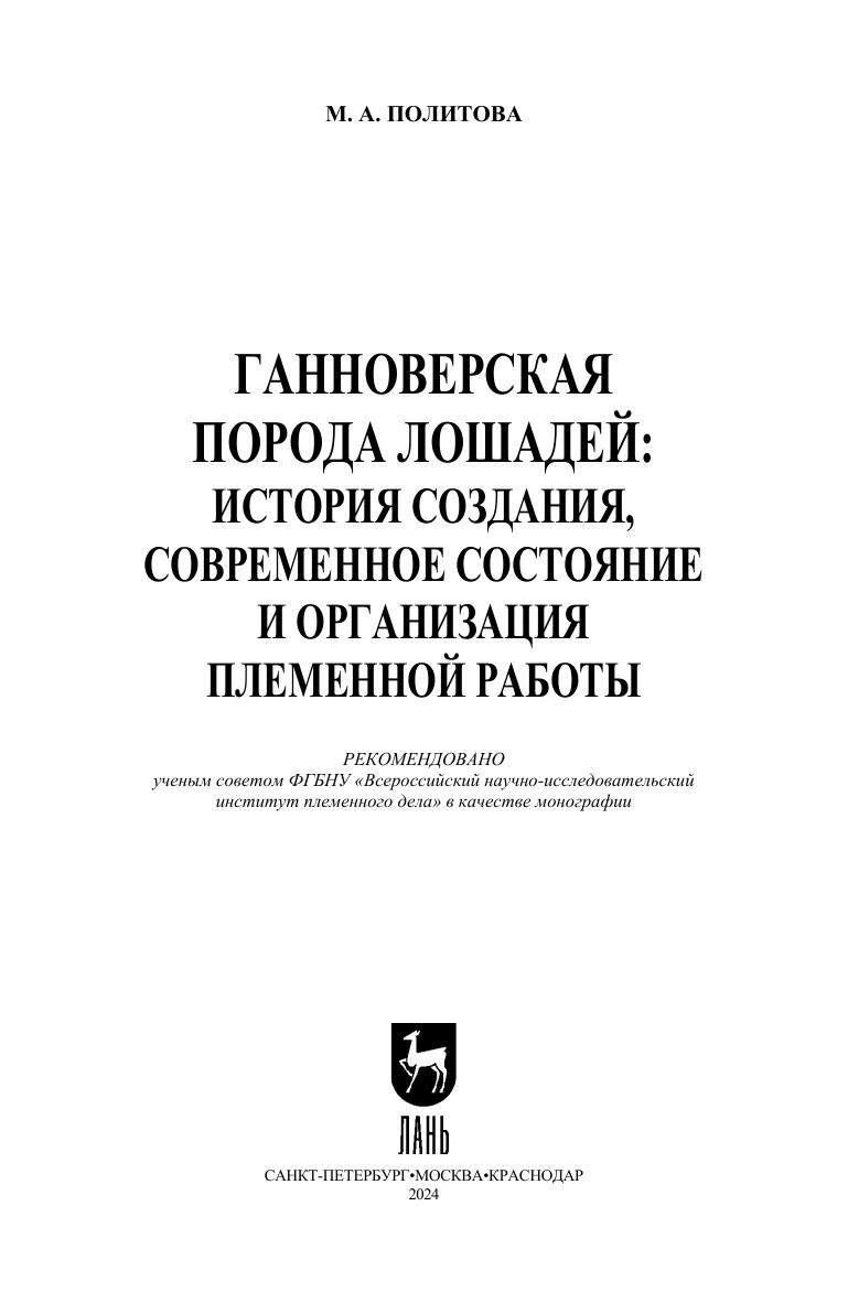 В настоящей монографии на примере ганноверской породы лошадей рассматриваются современные принципы организации племенной работы с полукровными породами спортивного направления использования, селекционные процессы, происходившие с породой, и изменение организации работы с популяцией в XXI веке, уделено особое внимание подходам к оценке работоспособности и племенной ценности. Автор подводит итоги практической работы по организации взаимодействия коннозаводчиков ганноверской породы Российской Федерации с зарубежными селекционными центрами и влияния международного сотрудничества на развитие отечественной популяции ганноверской породы. Монография представляет интерес как для ученых-исследователей и обучающихся по профильным специальностям, так и для специалистов-практиков.