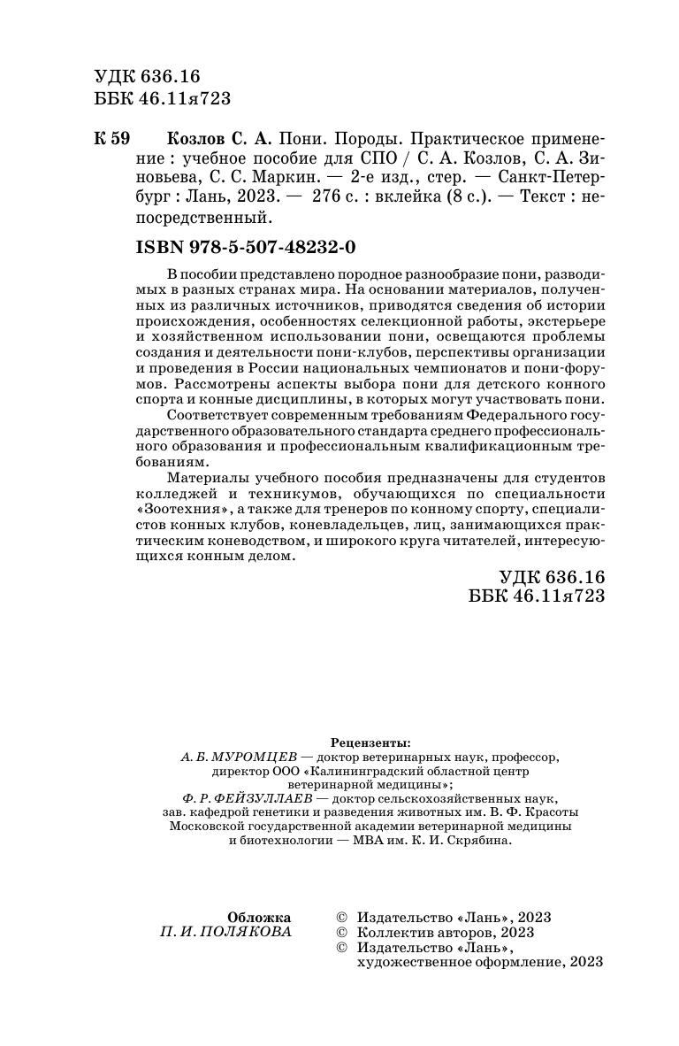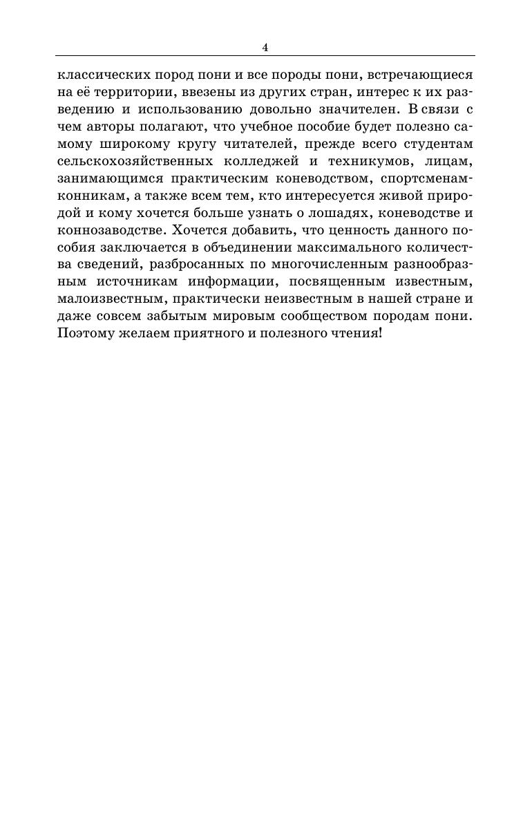 В пособии представлено породное разнообразие пони, разводимых в разных странах мира. На основании материалов, полученных из различных источников, приводятся сведения об истории происхождения, особенностях селекционной работы, экстерьере и хозяйственном использовании пони, освещаются проблемы создания и деятельности пони-клубов, перспективы организации и проведения в России национальных чемпионатов и пони-форумов. Рассмотрены аспекты выбора пони для детского конного спорта и конные дисциплины, в которых могут участвовать пони. Соответствует современным требованиям Федерального государственного образовательного стандарта среднего профессионального образования и профессиональным квалификационным требованиям. Материалы учебного пособия предназначены для обучающихся колледжей и техникумов, обучающихся по специальности «Зоотехния», а также для тренеров по конному спорту, специалистов конных клубов, коневладельцев, лиц, занимающимся практическим коневодством и самому широкому кругу читателей, интересующихся конным делом.