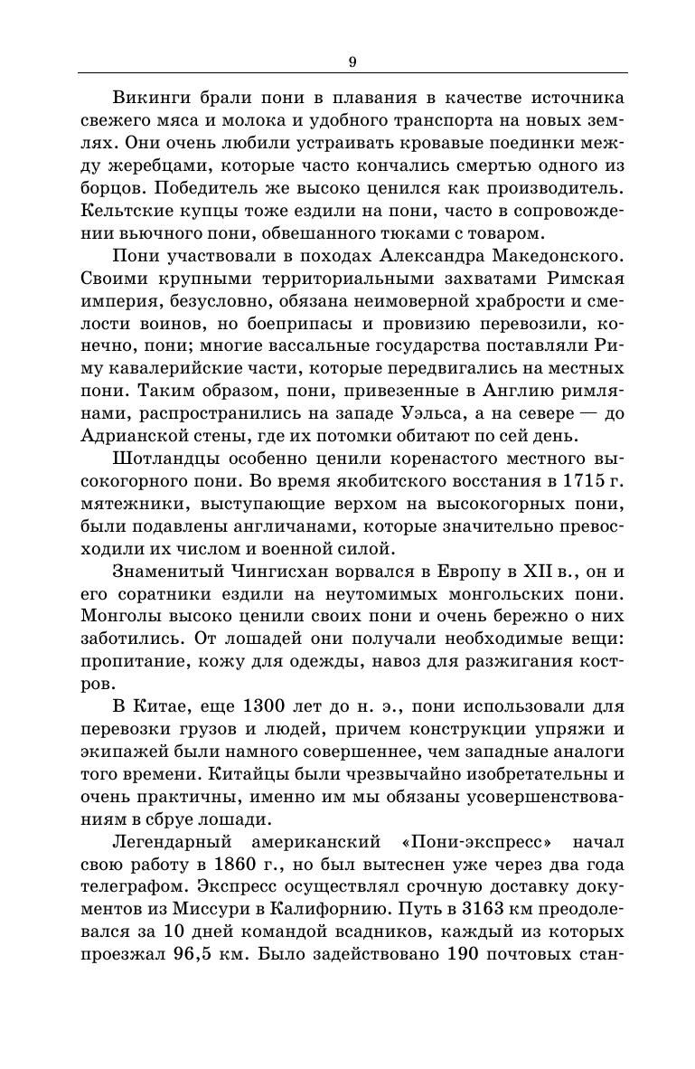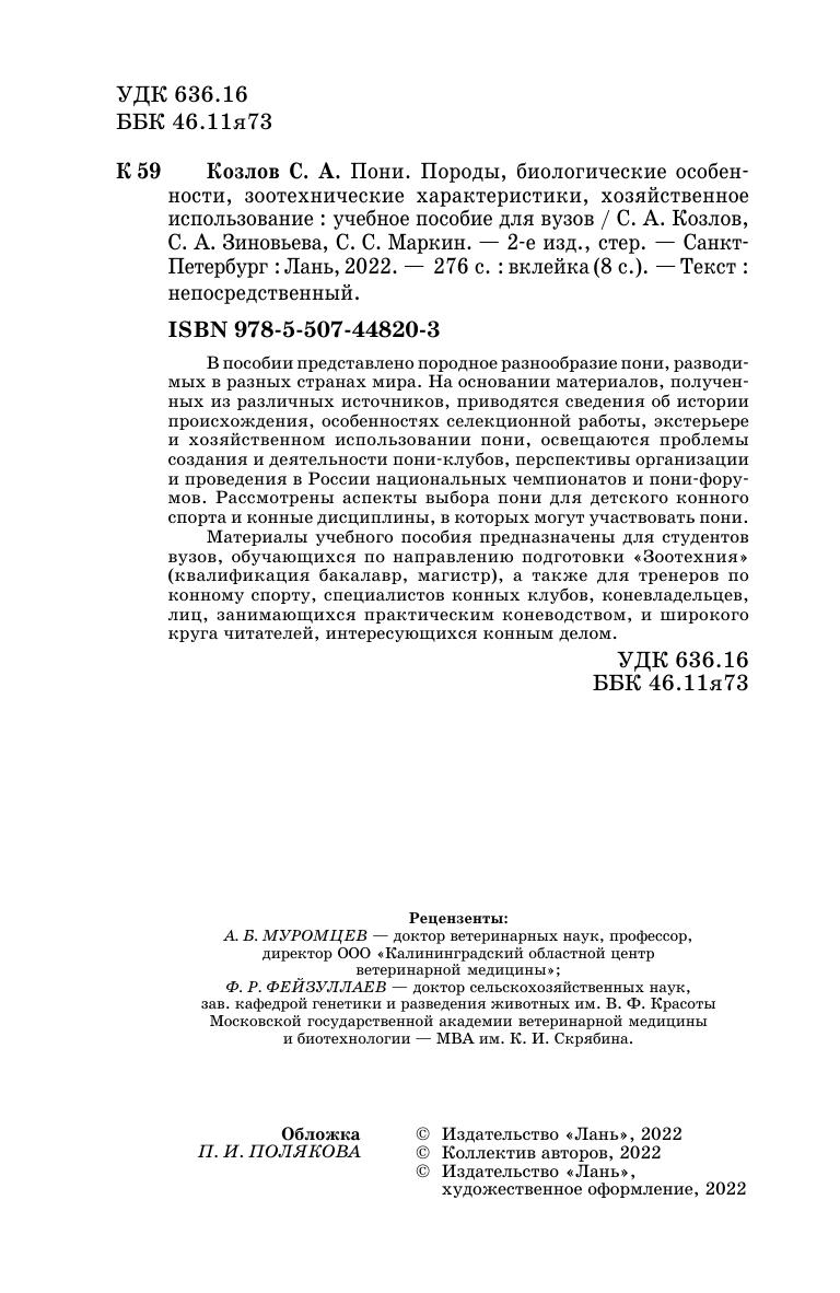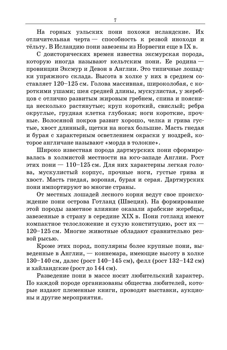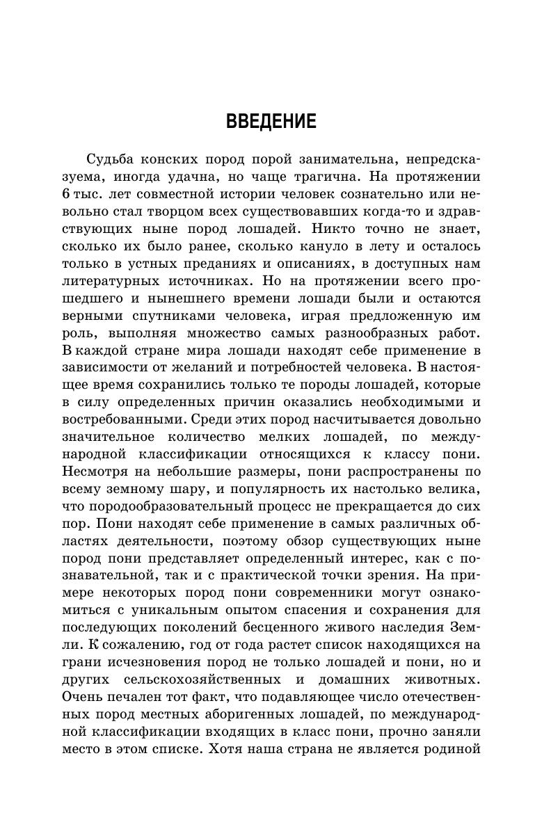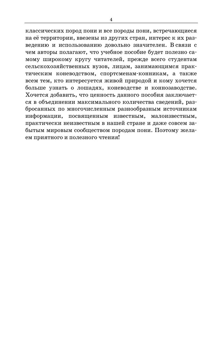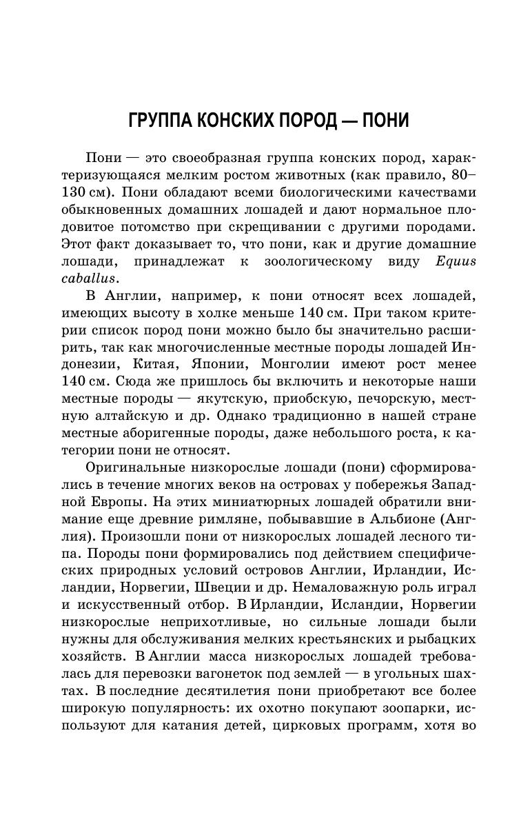 В пособии представлено породное разнообразие пони, разводимых в разных странах мира. На основании материалов, полученных из различных источников, приводятся сведения об истории происхождения, особенностях селекционной работы, экстерьере и хозяйственном использовании пони, освещаются проблемы создания и деятельности пони-клубов, перспективы организации и проведения в России национальных чемпионатов и пони-форумов. Рассмотрены аспекты выбора пони для детского конного спорта и конные дисциплины, в которых могут участвовать пони. Материалы учебного пособия предназначены для обучающихся по направлению подготовки: «Зоотехния» (квалификация бакалавр, магистр), а также для тренеров по конному спорту, специалистов конных клубов, коневладельцев, лиц, занимающимся практическим коневодством и самому широкому кругу читателей, интересующихся конным делом.