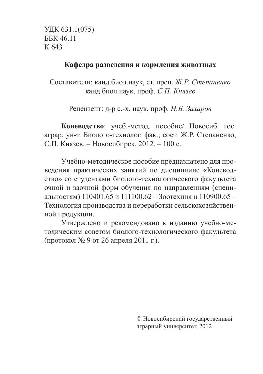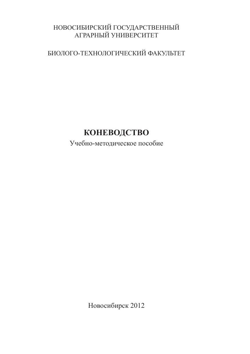 Учебно-методическое пособие предназначено для проведения практических занятий по дисциплине «Коневодство» со студентами биологотехнологического факультета очной и заочной форм обучения по направлениям (специальностям) 110401.65 и 111100.62 – Зоотехния и 110900.65 – Технология производства и переработки сельскохозяйственной продукции всех форм обучения.