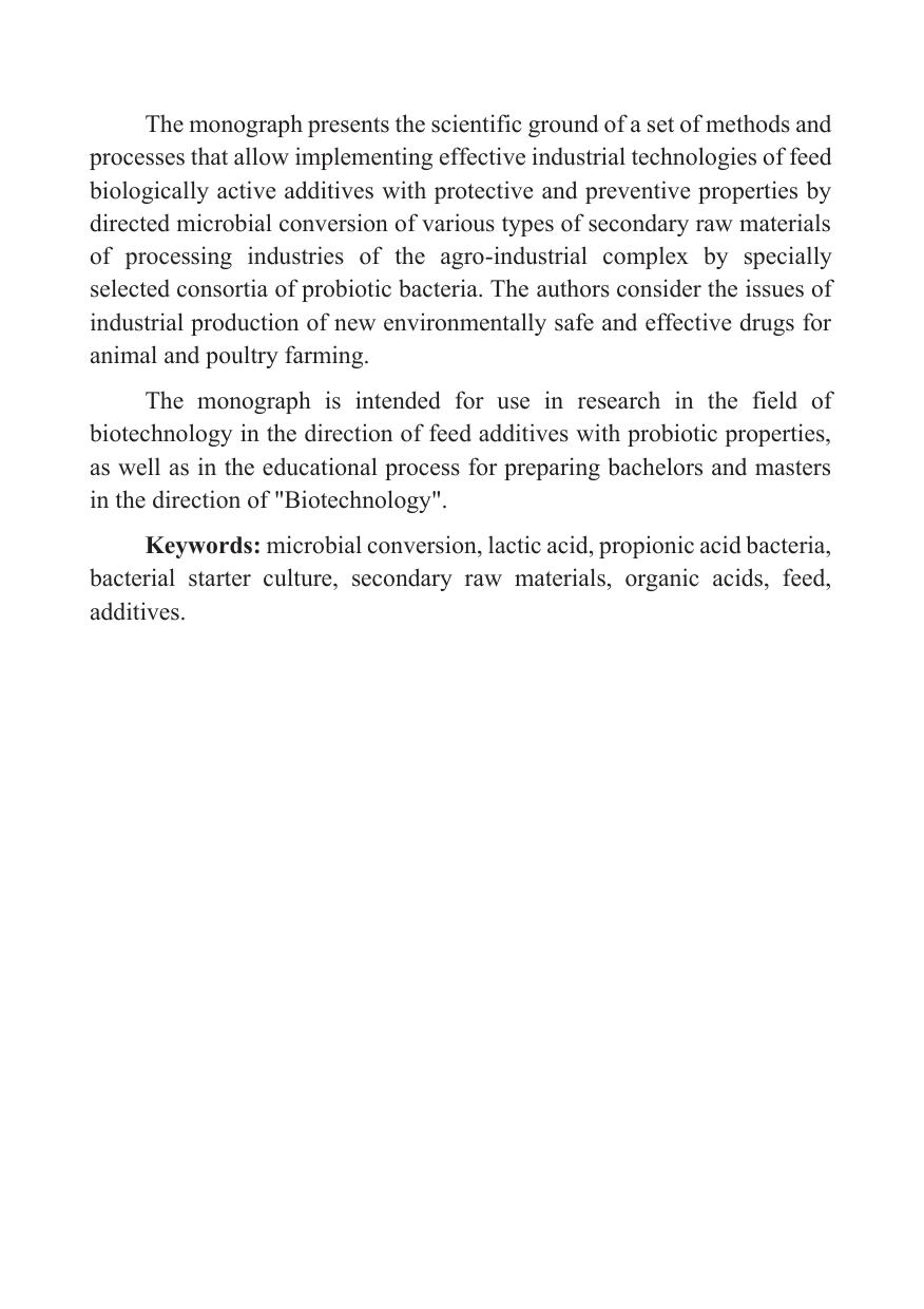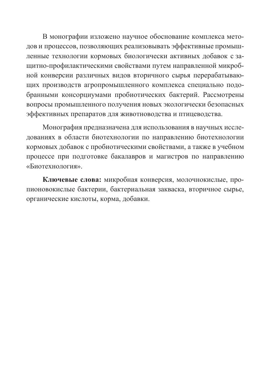 В монографии изложено научное обоснование комплекса методов и процессов, позволяющих реализовывать эффективные промышленные технологии кормовых биологически активных добавок с защитно-профилактическими свойствами путем направленной микробной конверсии различных видов вторичного сырья перерабатывающих производств агропромышленного комплекса специально подобранными консорциумами пробиотических бактерий. Рассмотрены вопросы промышленного получения новых экологически безопасных эффективных препаратов для животноводства и птицеводства.