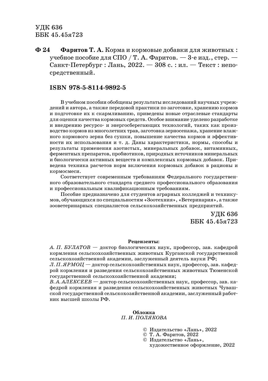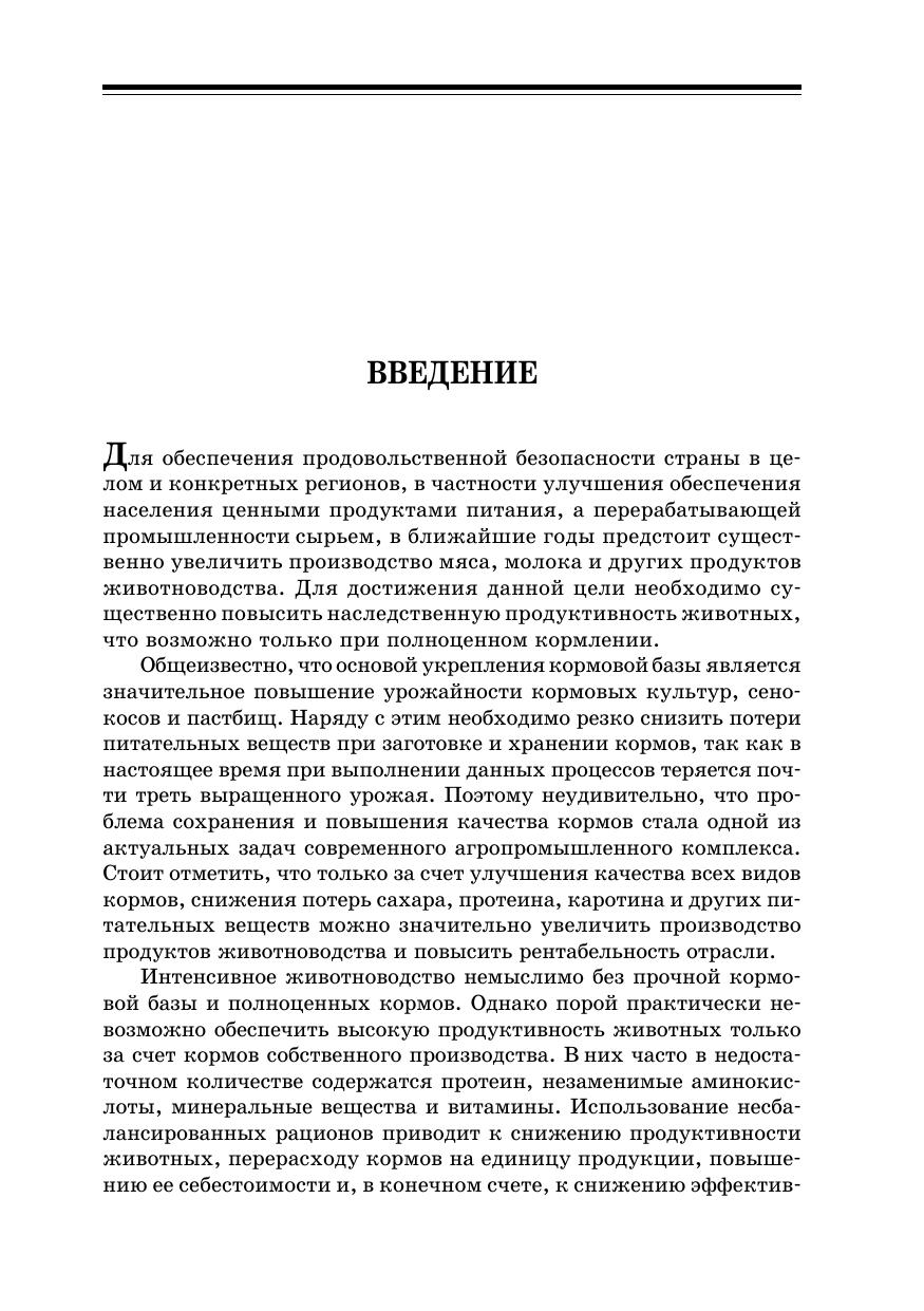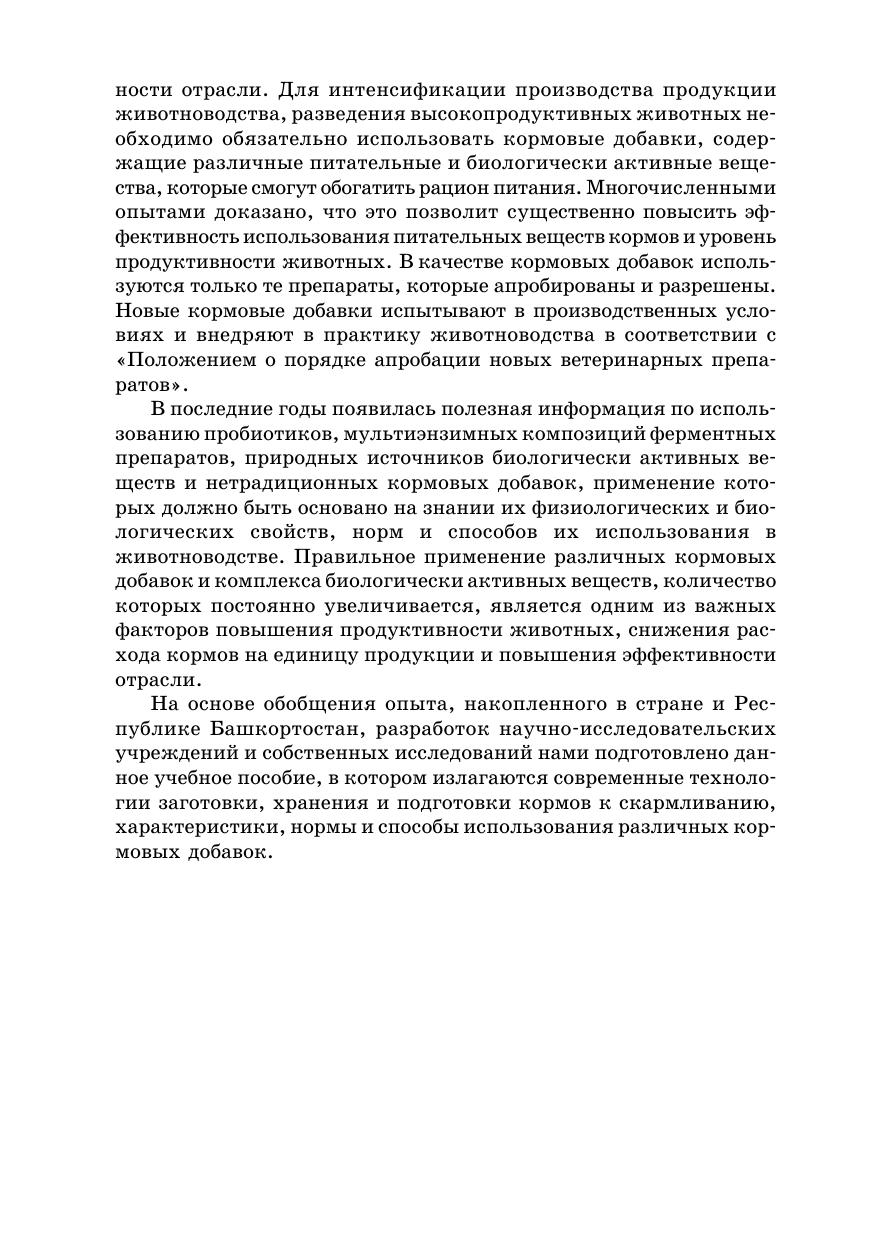 В учебном пособии обобщены результаты исследований научных учреждений и автора, а также передовой практики по заготовке, хранению кормов и подготовке их к скармливанию, приведены новые отраслевые стандарты для оценки качества кормовых средств. Особое внимание уделено разработке и внедрению ресурсо- и энергосберегающих технологий, таких как производство кормов из многолетних трав, заготовка зерносенажа, хранение влажного кормового зерна без сушки, повышение качества кормов и эффективности их использования и т. д. Даны характеристика, нормы, способы и результаты применения азотистых, минеральных добавок, витаминных, ферментных препаратов, пробиотиков, природных источников минеральных и биологически активных веществ и комплексных кормовых добавок. Приведена техника расчетов норм включения кормовых добавок в рационы и кормосмеси.