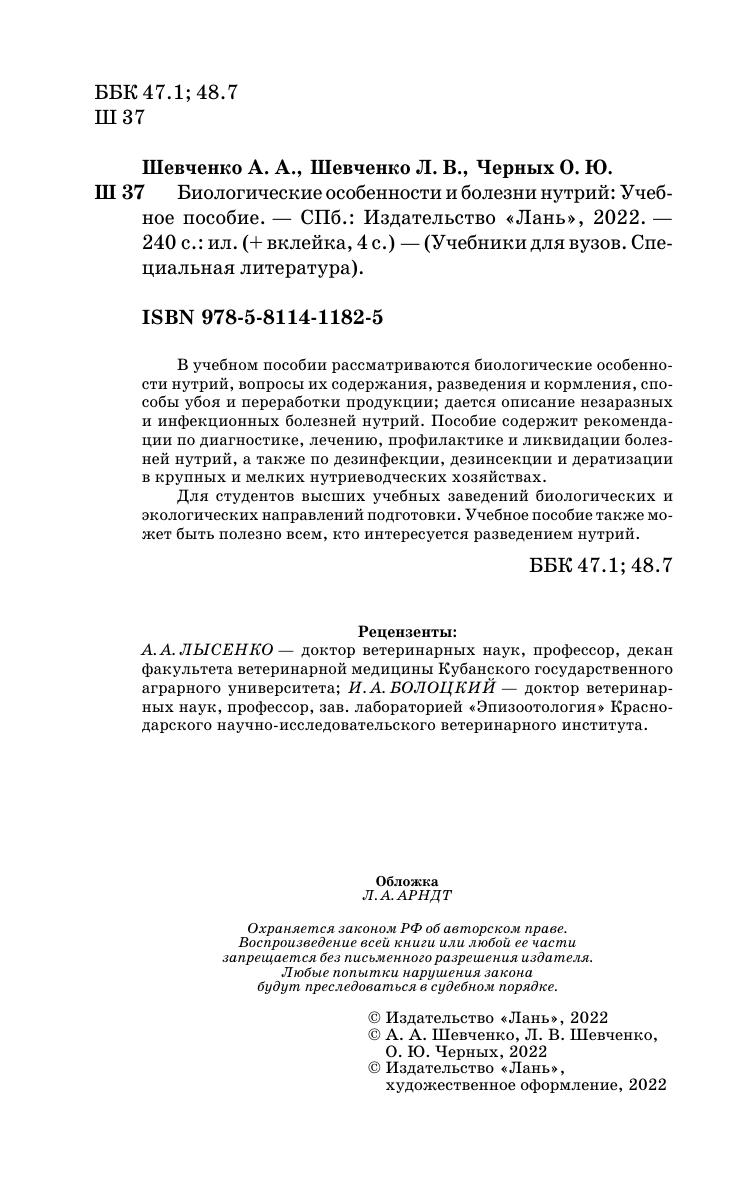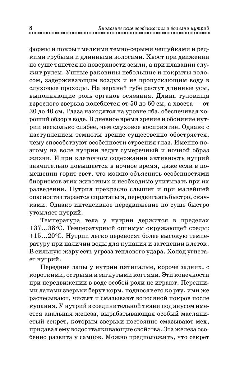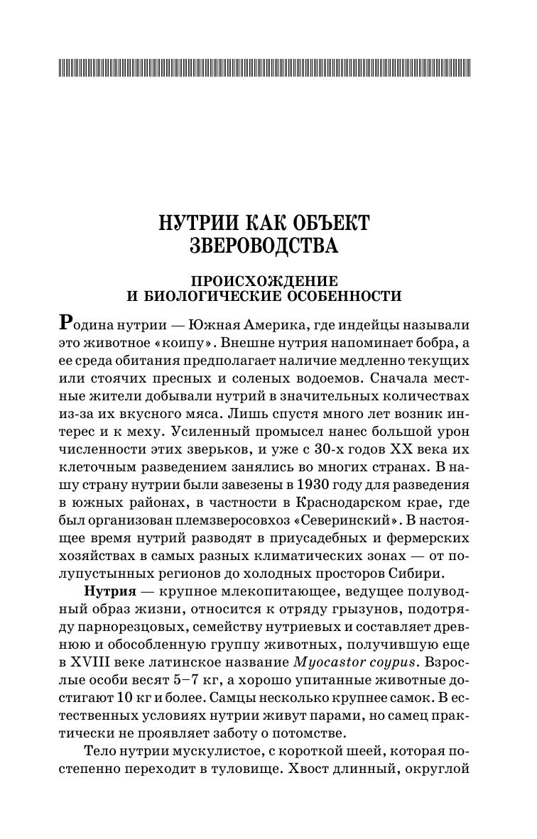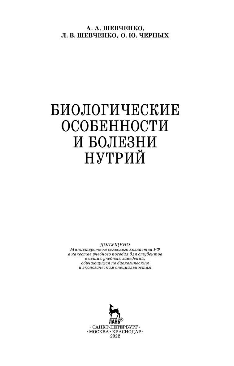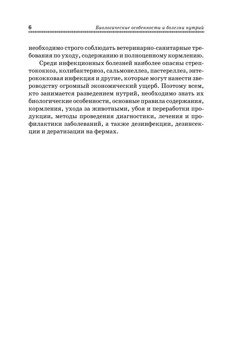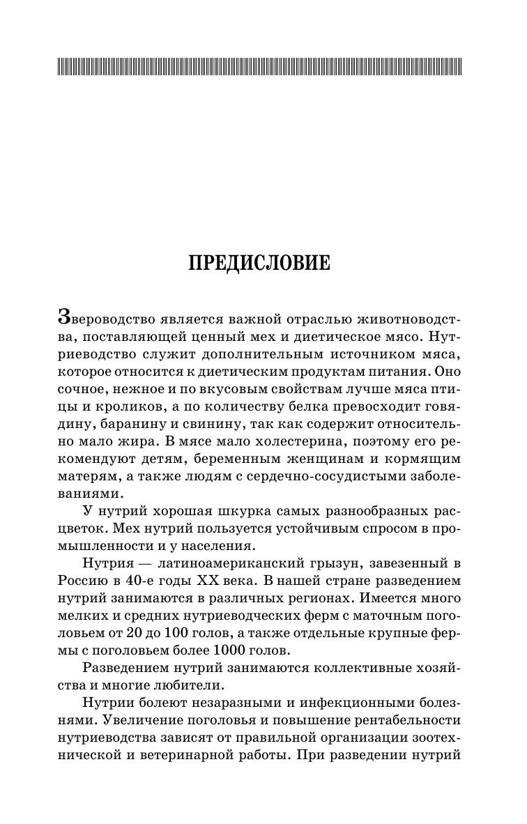 В учебном пособии рассматриваются биологические особенности нутрий, вопросы их содержания, разведения и кормления, способы убоя и переработки продукции, дается описание незаразных и инфекционных болезней нутрий. Пособие содержит рекомендации по диагностике, лечению, профилактике и ликвидации болезней нутрий, а также по дезинфекции, дезинсекции и дератизации в крупных и мелких нутриеводческих хозяйствах. Для студентов высших учебных заведений биологических и экологических направлений подготовки. Учебное пособие также может быть полезно всем, кто интересуется разведением нутрий.