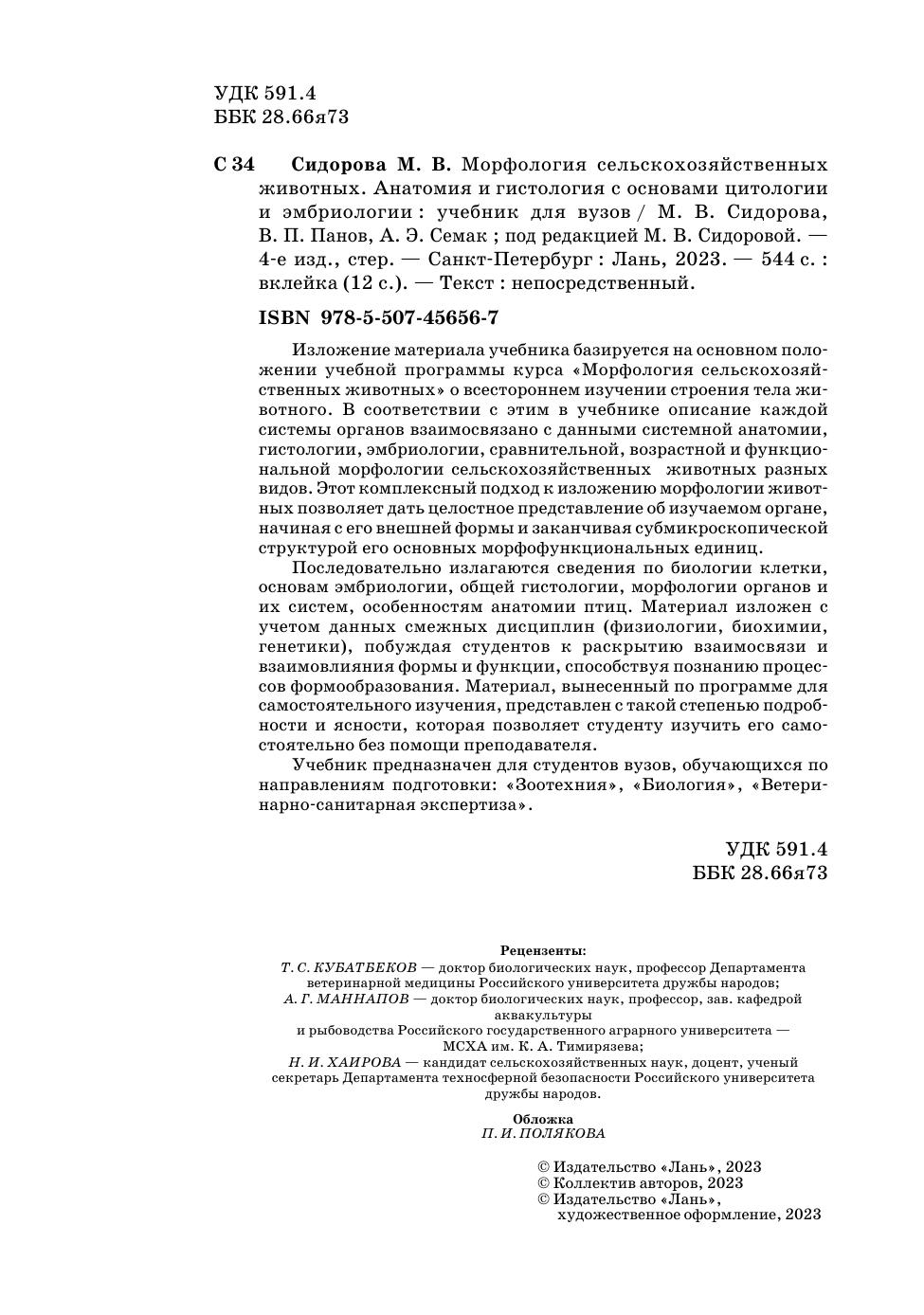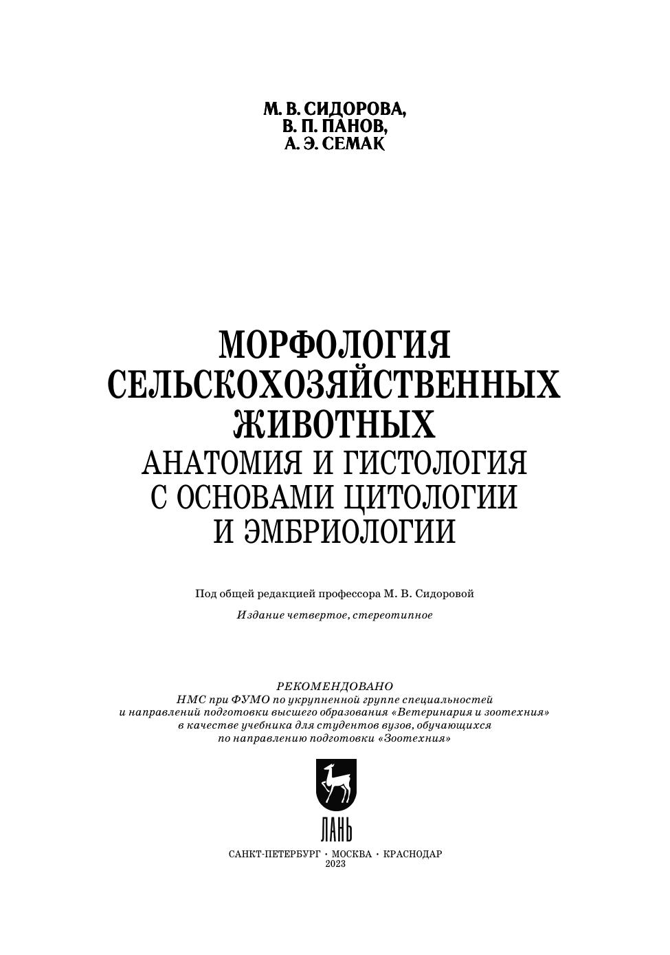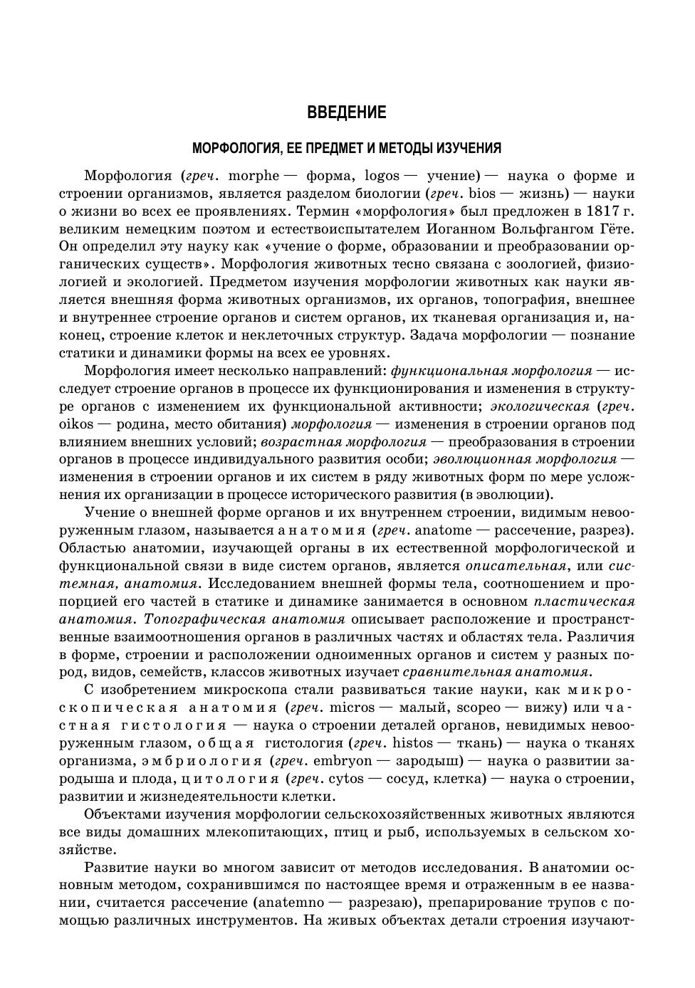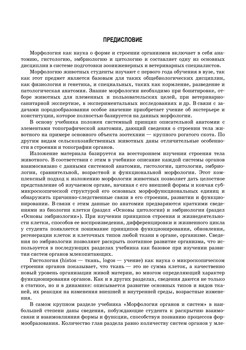 Изложение материала учебника базируется на основном положении учебной программы курса «Морфология сельскохозяйственных животных» о всестороннем изучении строения тела животного. В соответствии с этим в учебнике описание каждой системы органов взаимосвязано с данными системной анатомии, гистологии, эмбриологии, сравнительной, возрастной и функциональной морфологии сельскохозяйственных животных разных видов. Этот комплексный подход к изложению морфологии животных позволяет дать целостное представление об изучаемом органе, начиная с его внешней формы и кончая субмикроскопической структурой его основных морфофункциональных единиц. Последовательно излагаются сведения по биологии клетки, основам эмбриологии, общей гистологии, морфологии органов и их систем, особенностям анатомии птиц. Материал изложен с учетом данных смежных дисциплин (физиологии, биохимии, генетики), побуждая студентов к раскрытию взаимосвязи и взаимовлияния формы и функции, способствуя познанию процессов формообразования. Материал, вынесенный по программе для самостоятельного изучения, представлен с такой степенью подробности и ясности, которые позволяют студенту изучить его самостоятельно без помощи преподавателя. Учебник предназначен для студентов вузов, обучающихся по направлениям подготовки: «Зоотехния», «Биология», «Ветеринарно-санитарная экспертиза».