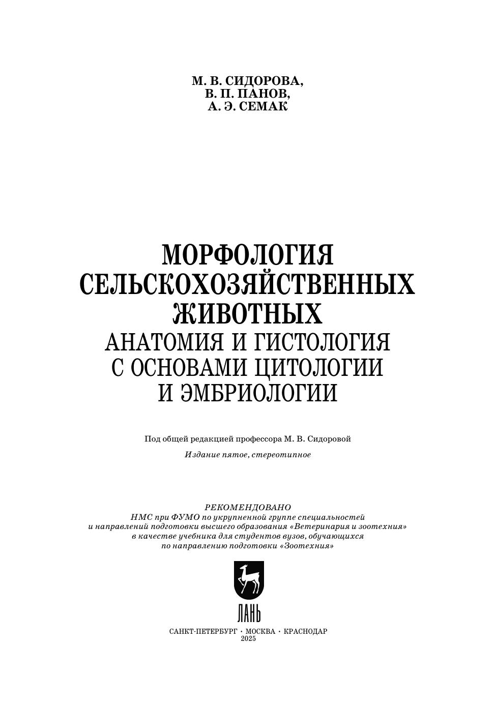 Изложение материала учебника базируется на основном положении учебной программы курса «Морфология сельскохозяйственных животных» о всестороннем изучении строения тела животного. В соответствии с этим в учебнике описание каждой системы органов взаимосвязано с данными системной анатомии, гистологии, эмбриологии, сравнительной, возрастной и функциональной морфологии сельскохозяйственных животных разных видов. Этот комплексный подход к изложению морфологии животных позволяет дать целостное представление об изучаемом органе, начиная с его внешней формы и кончая субмикроскопической структурой его основных морфофункциональных единиц. Последовательно излагаются сведения по биологии клетки, основам эмбриологии, общей гистологии, морфологии органов и их систем, особенностям анатомии птиц. Материал изложен с учетом данных смежных дисциплин (физиологии, биохимии, генетики), побуждая студентов к раскрытию взаимосвязи и взаимовлияния формы и функции, способствуя познанию процессов формообразования. Материал, вынесенный по программе для самостоятельного изучения, представлен с такой степенью подробности и ясности, которые позволяют студенту изучить его самостоятельно без помощи преподавателя. Учебник предназначен для студентов вузов, обучающихся по направлениям подготовки: «Зоотехния», «Биология», «Ветеринарно-санитарная экспертиза».