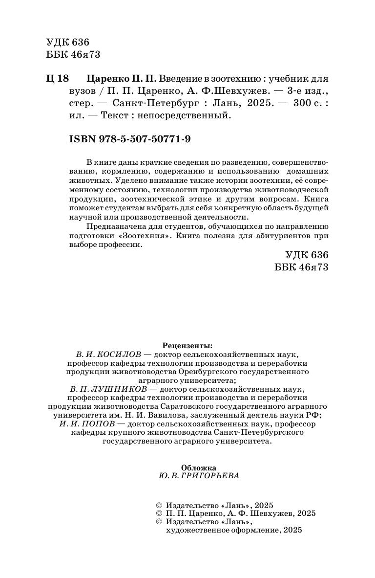 В книге даны краткие сведения по разведению, совершенствованию, кормлению, содержанию и использованию домашних животных. Уделено внимание также истории зоотехнии, её современному состоянию, технологии производства животноводческой продукции, зоотехнической этике и другим вопросам. Книга поможет студентам выбрать для себя конкретную область будущей научной или производственной деятельности. Предназначена для студентов, обучающихся по направлению подготовки «Зоотехния». Книга полезна для абитуриентов при выборе профессии.