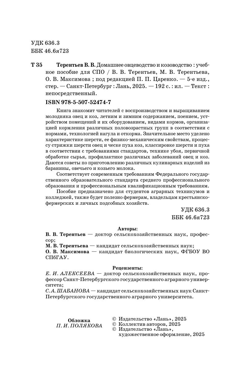 Книга знакомит читателей с воспроизводством и выращиванием молодняка овец и коз, летним и зимним содержанием, поением, устройством помещений и их оборудованием, видами кормов, организацией кормления различных половозрастных групп в соответствии с нормами, технологией нагула и откорма. Значительное место уделено характеристике шерсти, ее физико-механическим свойствам, процессу стрижки шерсти овец и ческе пуха коз, классировке шерсти и пуха в соответствии с требованиями стандартов, технике убоя, первичной обработке сырья, профилактике различных заболеваний овец и коз. Даются советы по приготовлению различных кулинарных изделий из баранины, овечьего и козьего молока. Соответствует современным требованиям Федерального государственного образовательного стандарта среднего профессионального образования и профессиональным квалификационным требованиям. Пособие предназначено для студентов аграрных техникумов и колледжей, также будет полезно фермерам, владельцам крестьянско-фермерских и личных подсобных хозяйств.