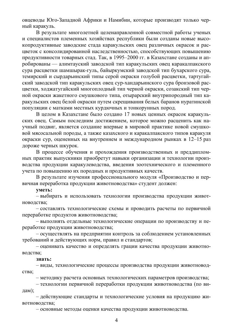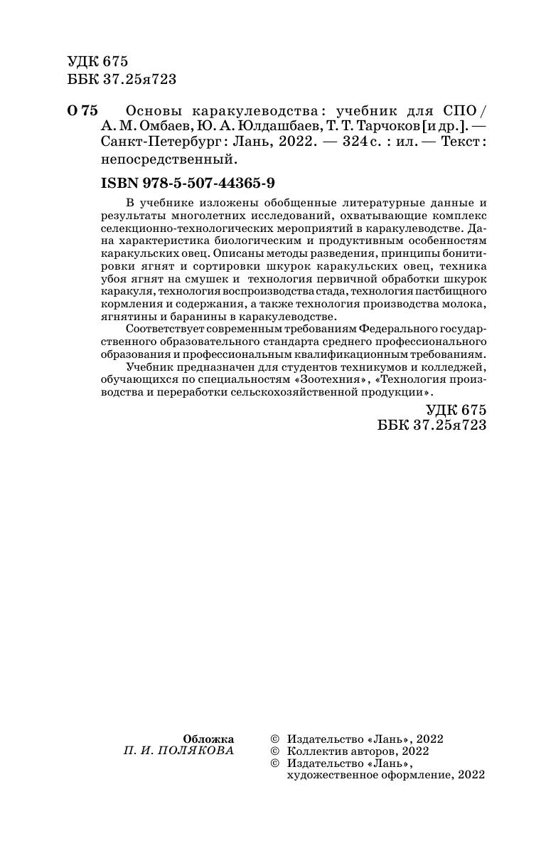 В учебнике изложены обобщенные данные литературы и результаты многолетних исследований, охватывающие комплекс селекционно-технологических мероприятий в каракулеводстве. Дана характеристика биологическим и продуктивным особенностям каракульских овец. Описаны методы разведения, принципы бонитировки ягнят и сортировки шкурок каракульских овец, техника убоя ягнят на смушек и технология первичной обработки шкурок каракуля, технология воспроизводства стада, технология пастбищного кормления и содержания, а также технология производства молока, ягнятины и баранины в каракулеводстве. Соответствует современным требованиям Федерального государственного образовательного стандарта среднего профессионального образования и профессиональным квалификационным требованиям. Учебник предназначен для студентов техникумов и колледжей, обучающихся по специальностям «Зоотехния», «Технология производства и переработки сельскохозяйственной продукции».