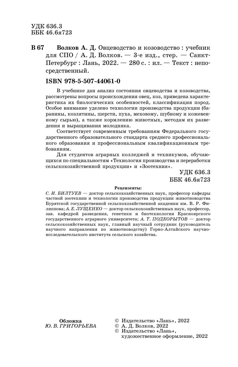В учебнике дан анализ состояния овцеводства и козоводства, рассмотрены вопросы происхождения овец, коз, приведена характеристика их биологических особенностей, классификация пород. Особое внимание уделено технологии производства продукции (баранины, козлятины, шерсти, пуха, меховому, шубному и кожевенному сырью), а также кормлению животных, методам их разведения и выращиванию молодняка. Соответствует современным требованиям Федерального государственного образовательного стандарта среднего профессионального образования и профессиональным квалификационным требованиям. Для студентов аграрных колледжей и техникумов, обучающихся по специальностям «Технология производства и переработки сельскохозяйственной продукции» и «Зоотехния».