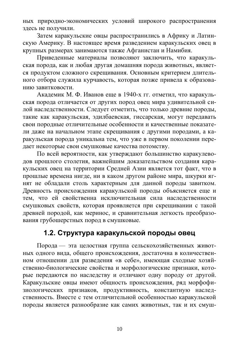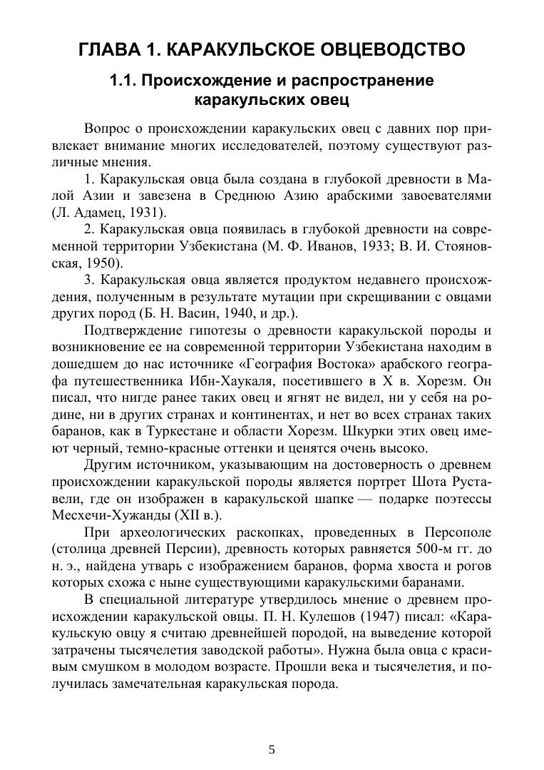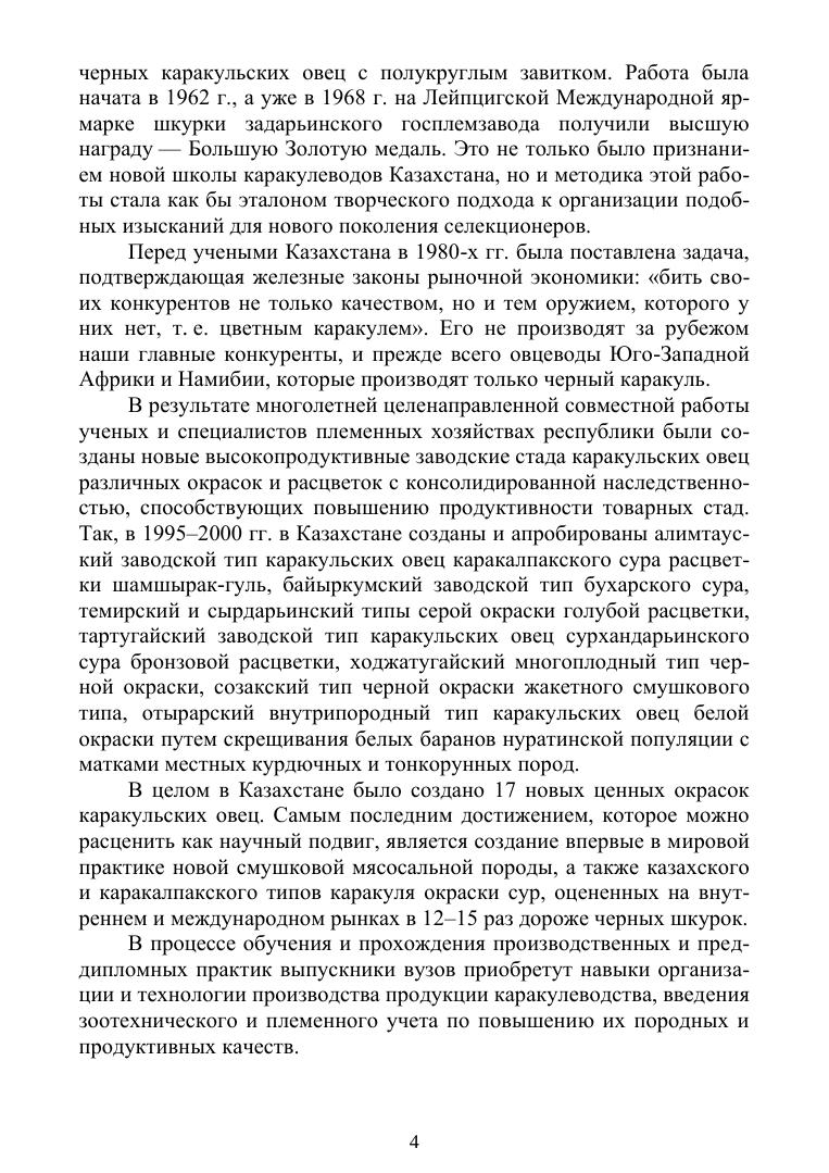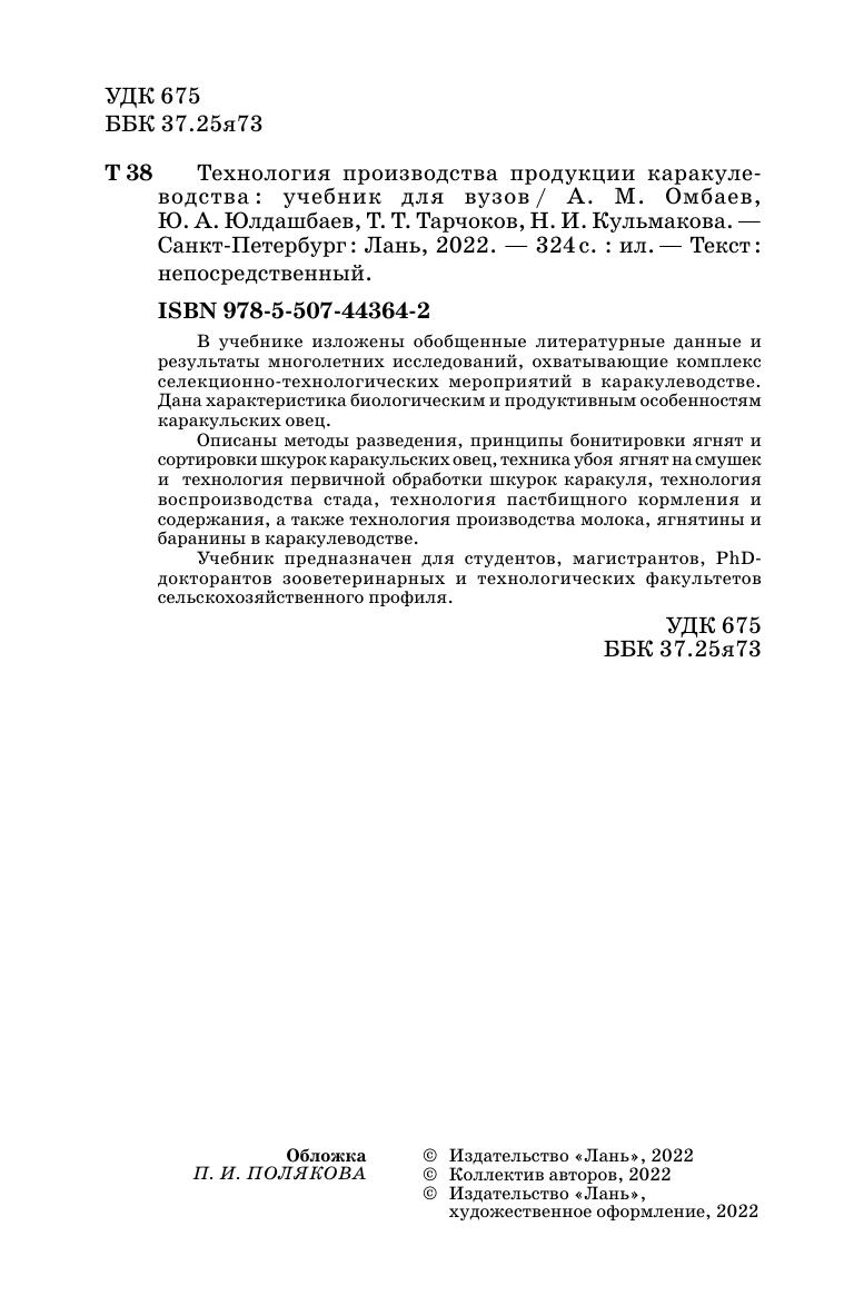 В учебнике изложены обобщенные литературные данные и результаты многолетних исследований, охватывающие комплекс селекционно-технологических мероприятий в каракулеводстве. Дана характеристика биологическим и продуктивным особенностям каракульских овец. Описаны методы разведения, принципы бонитировки ягнят и сортировки шкурок каракульских овец, техника убоя ягнят на смушек и технология первичной обработки шкурок каракуля, технология воспроизводства стада, технология пастбищного кормления и содержания, а также технология производства молока, ягнятины и баранины в каракулеводстве. Учебник предназначен для студентов, магистрантов, PhD-докторантов зооветеринарных и технологических факультетов сельскохозяйственного профиля.