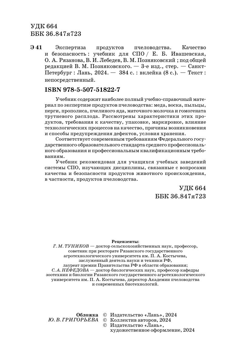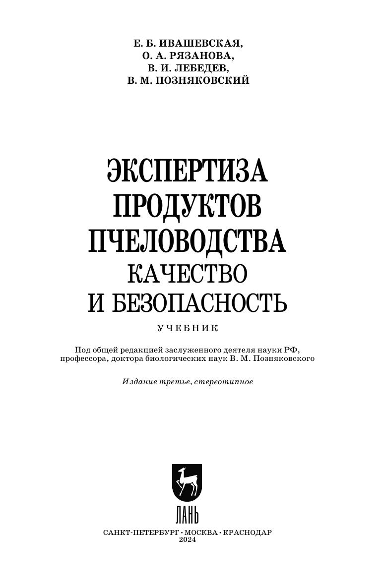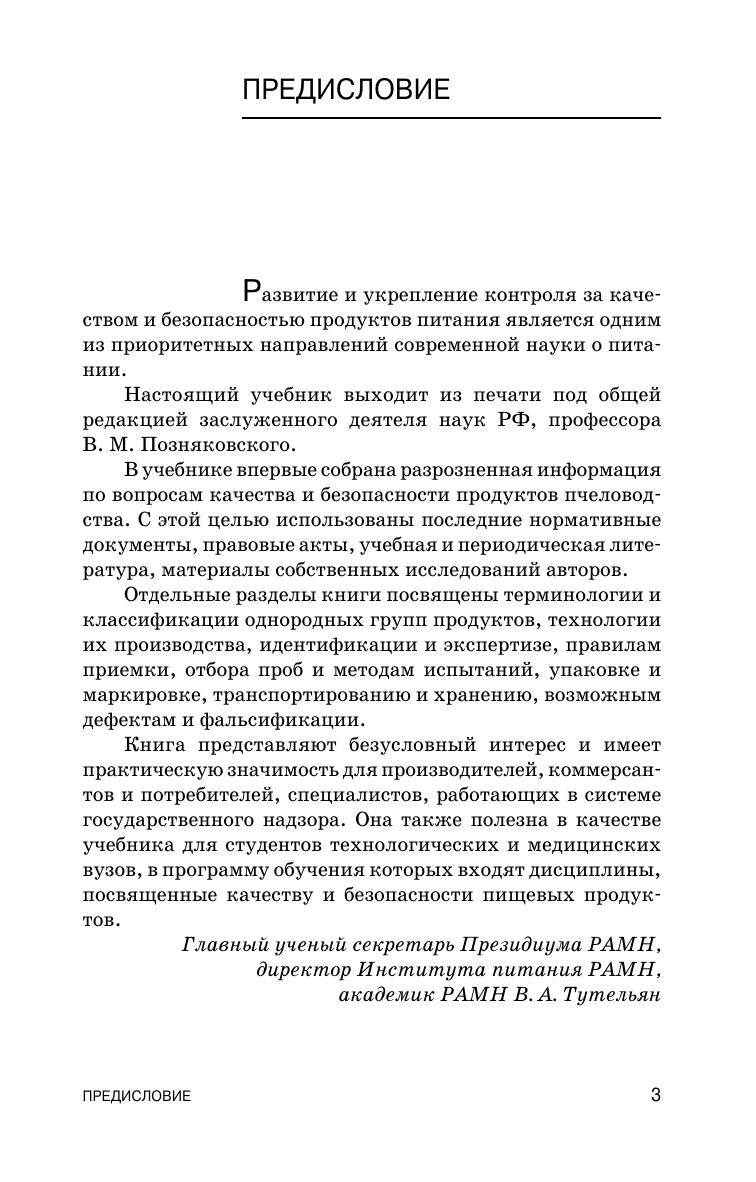 Учебник содержит наиболее полный учебно-справочный материал по экспертизе продуктов пчеловодства: меда, воска, пыльцы, перги, прополиса, пчелиного яда, маточного молочка и гомогената трутневого расплода. Рассмотрены характеристики этих продуктов, требования к качеству, упаковке, маркировке, влияние технологических процессов на качество, причины возникновения и способы предупреждения дефектов, условия хранения. Соответствует современным требованиям Федерального государственного образовательного стандарта среднего профессионального образования и профессиональным квалификационным требованиям. Учебник рекомендован для учащихся учебных заведений системы СПО, изучающих дисциплины, связанные с вопросами качества и безопасности продуктов животного происхождения, в частности, продуктов пчеловодства.