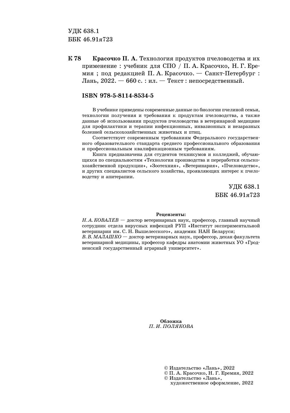 В учебнике приведены современные данные по биологии пчелиной семьи, технологии получения и требования к продуктам пчеловодства, a также данные об использовании продуктов пчеловодства в ветеринарной медицине для профилактики и терапии инфекционных, инвазионных и незаразных болезней сельскохозяйственных животных и птиц.