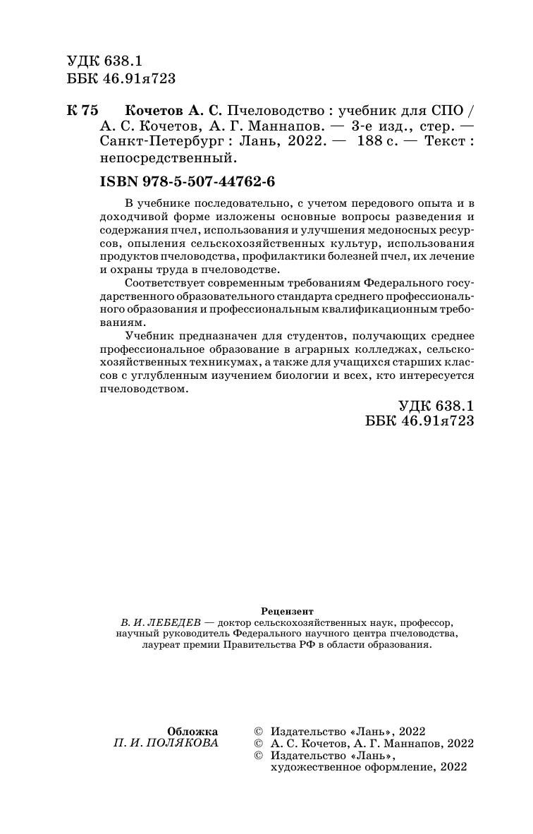 В учебнике последовательно, научно обоснованно, с учетом передового опыта и в доходчивой форме изложены основные вопросы разведения и содержания пчел, использования и улучшения медоносных ресурсов, опыления сельскохозяйственных культур, использования продуктов пчеловодства, профилактики болезней пчел, лечение их и охрана труда в пчеловодстве. Соответствует современным требованиям Федерального государственного образовательного стандарта среднего профессионального образования и профессиональным квалификационным требованиям. Учебник предназначен для студентов, получающих среднее профессиональное образование в аграрных колледжах, сельскохозяйственных техникумах, а также для учащихся старших классов с углубленным изучением биологии и всем, кто интересуется пчеловодством.