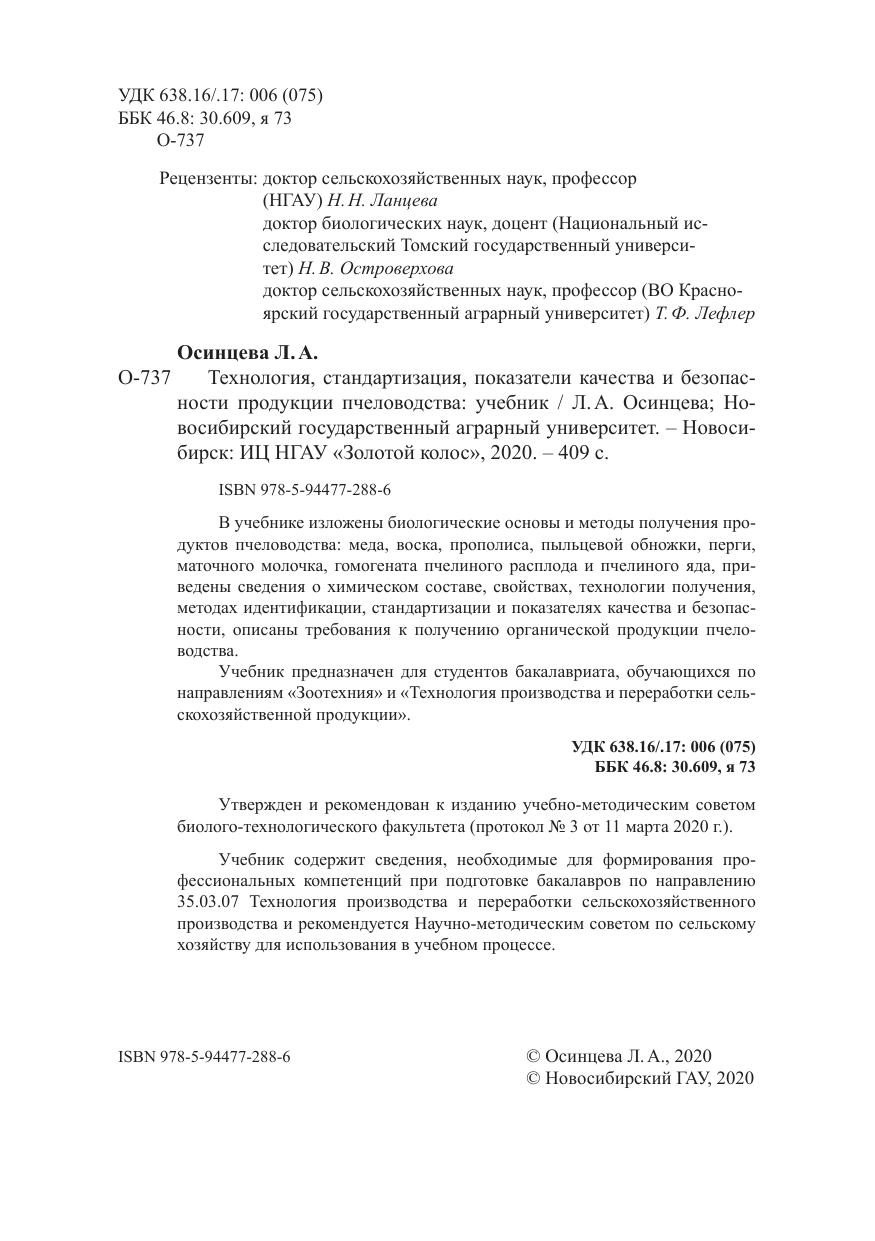 В учебнике изложены биологические основы и методы получения продуктов пчеловодства: меда, воска, прополиса, пыльцевой обножки, перги, маточного молочка, гомогената пчелиного расплода и пчелиного яда, приведены сведения о химическом составе, свойствах, технологии получения, методах идентификации, стандартизации и показателях качества и безопасности, описаны требования к получению органической продукции пчеловодства. Учебник предназначен для студентов бакалавриата, обучающихся по направлениям «Зоотехния» и «Технология производства и переработки сельскохозяйственной продукции».