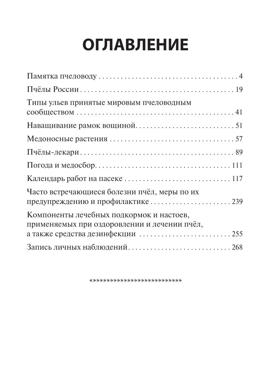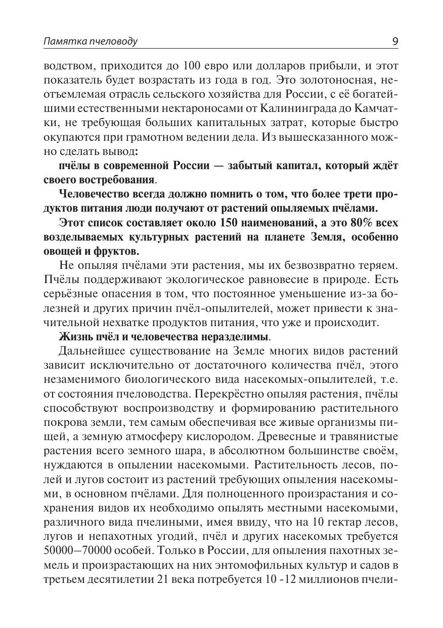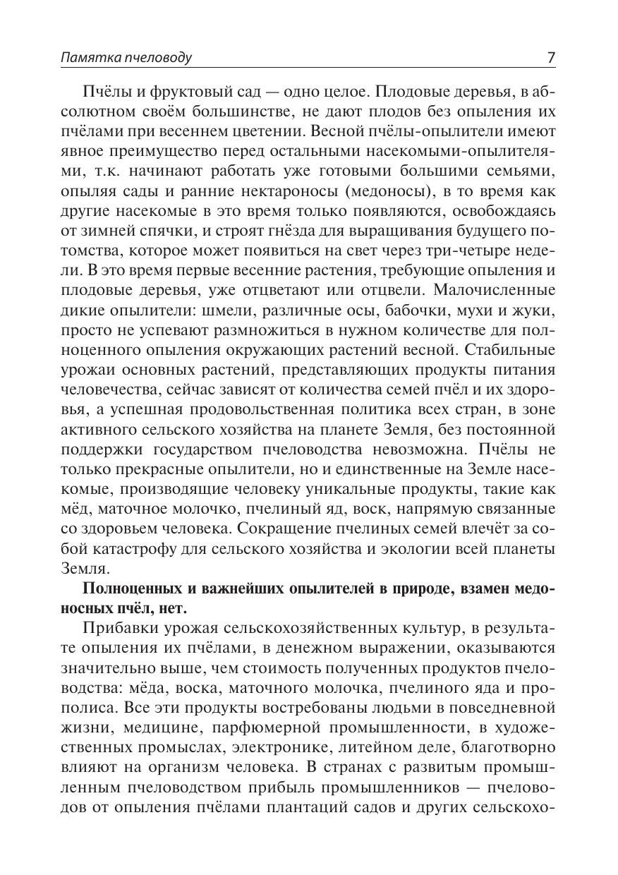 В книге даны необходимые пчеловоду сведения о пчёлах, нектароносных и пыльценосных растениях, их фенологии, типах ульев, о качестве медов и их лечебных свойствах, порядке и правилах обращения с пчёлами на приусадебной пасеке в течение круглого года, погодных условиях, а также основные практические приёмы ухода за пчёлами, доступные любому желающему ухаживать за пчёлами, получать от этого моральное и материальное удовлетворение в виде мёда и других продуктов производимых пчёлами, с целью использования их в семейном пищевом рационе каждодневного здорового питания, а также для лечения, в случае необходимости. Учитывая громадный природно-географический потенциал пчеловодства России, ежегодное увеличение пчелиных семей и пчеловодов позволит в ближайшие годы довести сбор мёда в стране до такого уровня, что создаст условия постоянно, в обязательном порядке, включать мёд в рацион питания в дошкольных детских учреждениях, школах, воинских частях армии и флота России, а также лечебных учреждениях, как это уже сделано в ряде стран Азии.
