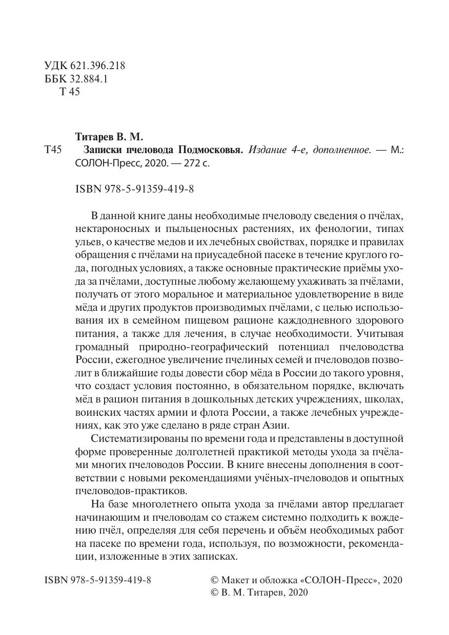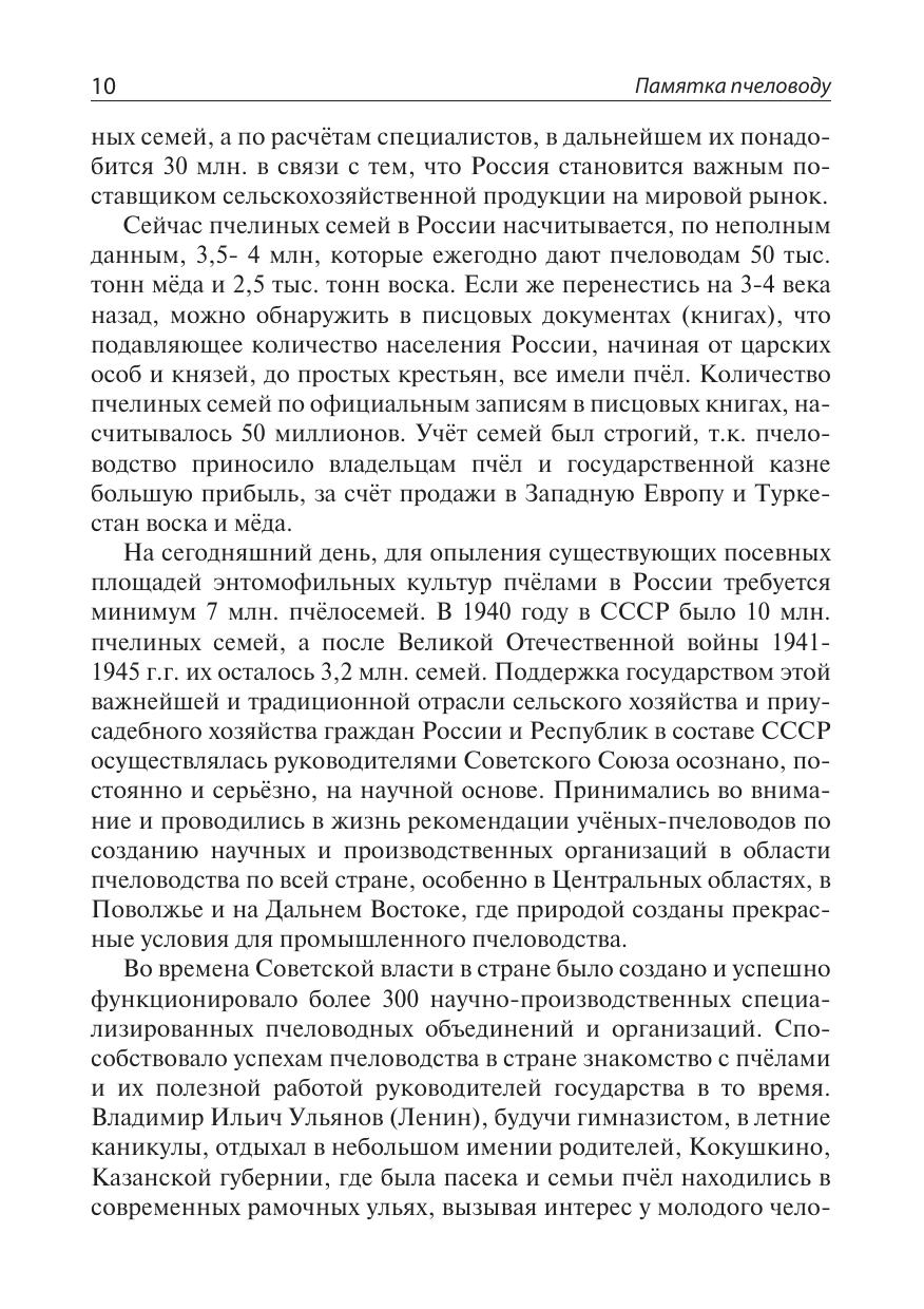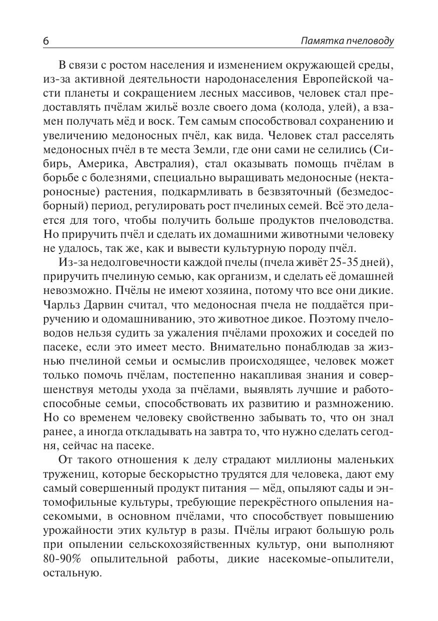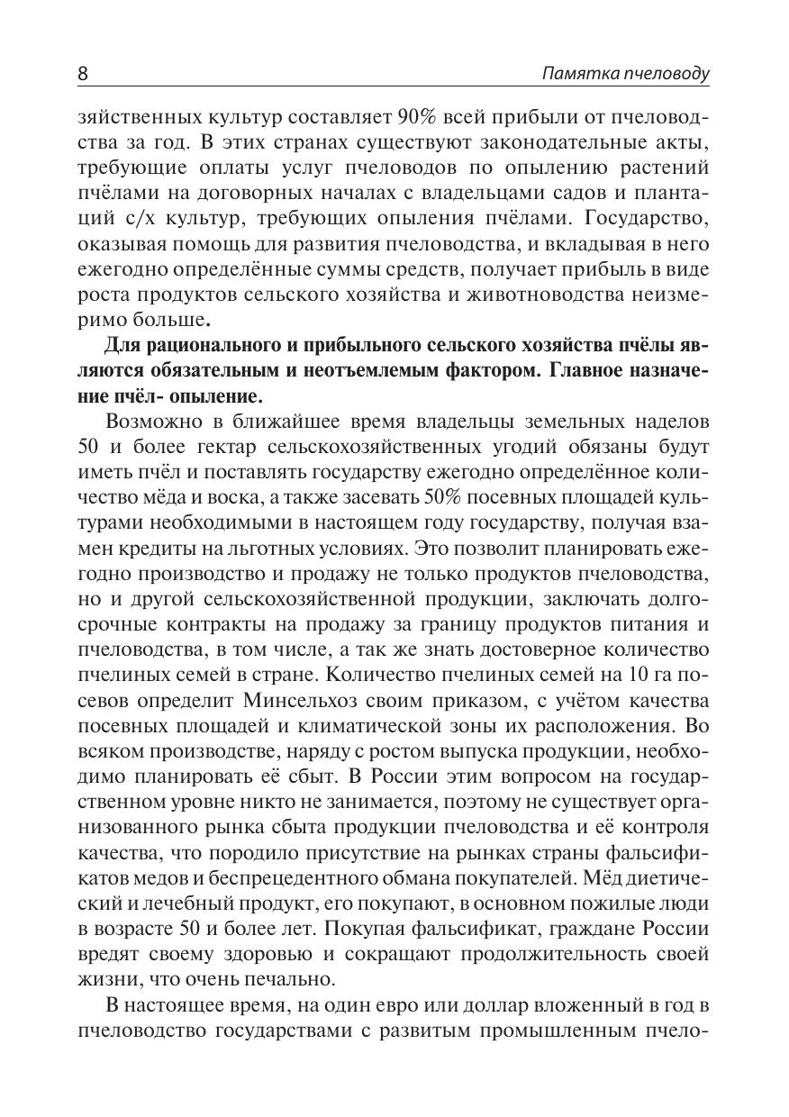 В книге даны необходимые пчеловоду сведения о пчёлах, нектароносных и пыльценосных растениях, их фенологии, типах ульев, о качестве медов и их лечебных свойствах, порядке и правилах обращения с пчёлами на приусадебной пасеке в течение круглого года, погодных условиях, а также основные практические приёмы ухода за пчёлами, доступные любому желающему ухаживать за пчёлами, получать от этого моральное и материальное удовлетворение в виде мёда и других продуктов производимых пчёлами, с целью использования их в семейном пищевом рационе каждодневного здорового питания, а также для лечения, в случае необходимости. Учитывая громадный природно-географический потенциал пчеловодства России, ежегодное увеличение пчелиных семей и пчеловодов позволит в ближайшие годы довести сбор мёда в стране до такого уровня, что создаст условия постоянно, в обязательном порядке, включать мёд в рацион питания в дошкольных детских учреждениях, школах, воинских частях армии и флота России, а также лечебных учреждениях, как это уже сделано в ряде стран Азии.
