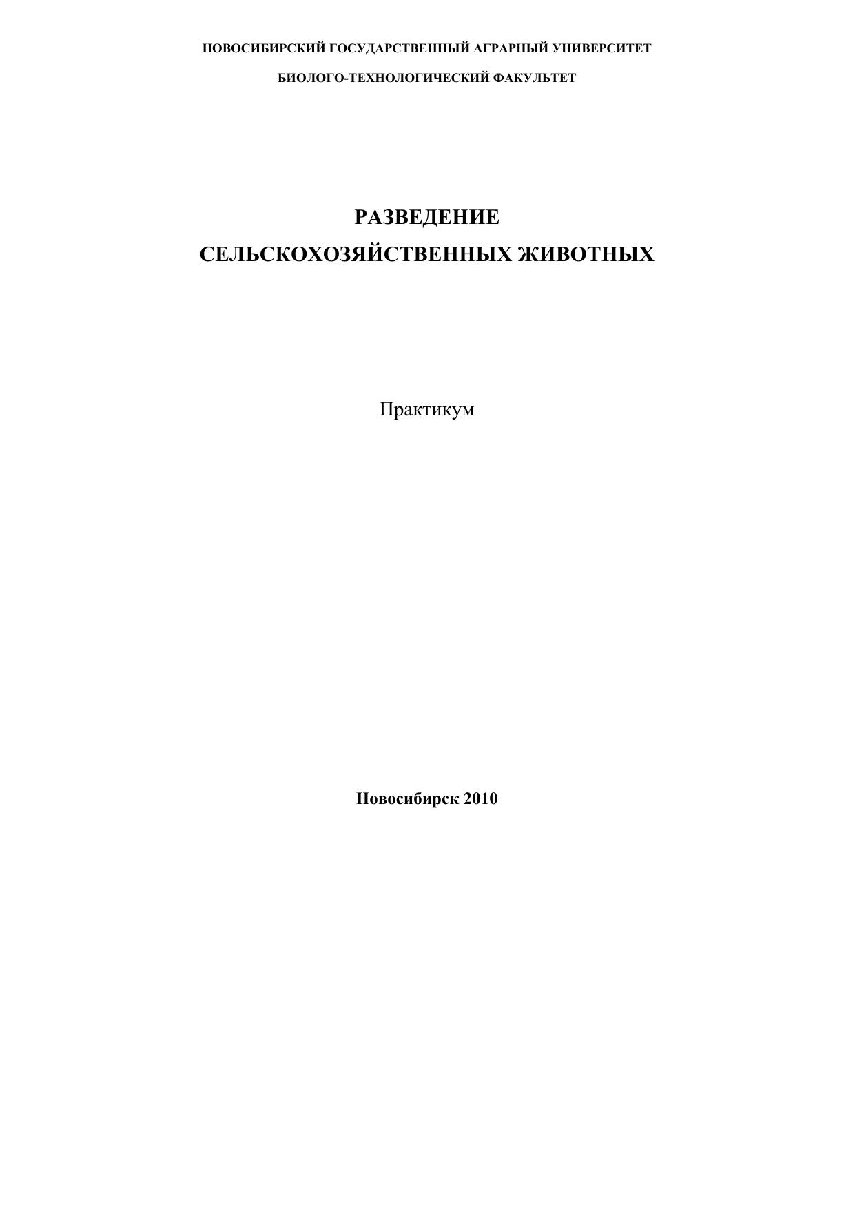 Практикум предназначен для выполнения практических заданий по дисциплине «Разведение с.-х. животных» для студентов очного и заочного отделений Биолого-технологического факультета, обучающихся по специальности 110401 – Зоотехния.