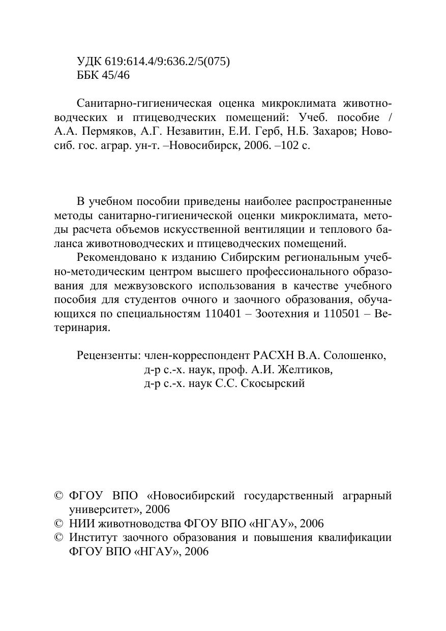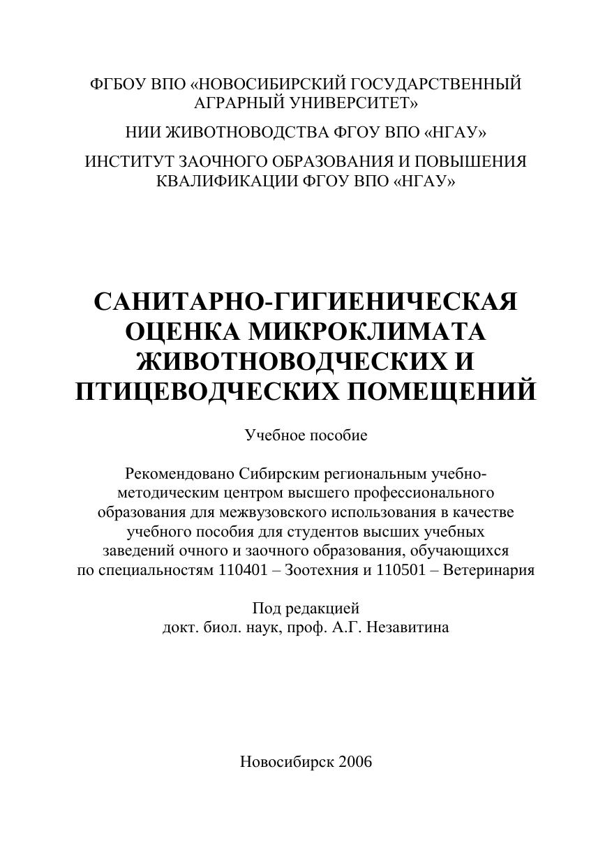 В учебном пособии приведены наиболее распространенные методы санитарно-гигиенической оценки микроклимата, мето-ды расчета объемов искусственной вентиляции и теплового ба-ланса животноводческих и птицеводческих помещений. Рекомендовано к изданию Сибирским региональным учеб-но-методическим центром высшего профессионального образо-вания для межвузовского использования в качестве учебного пособия для студентов очного и заочного образования, обуча-ющихся по специальностям 110401 – Зоотехния и 110501 – Ве-теринария.