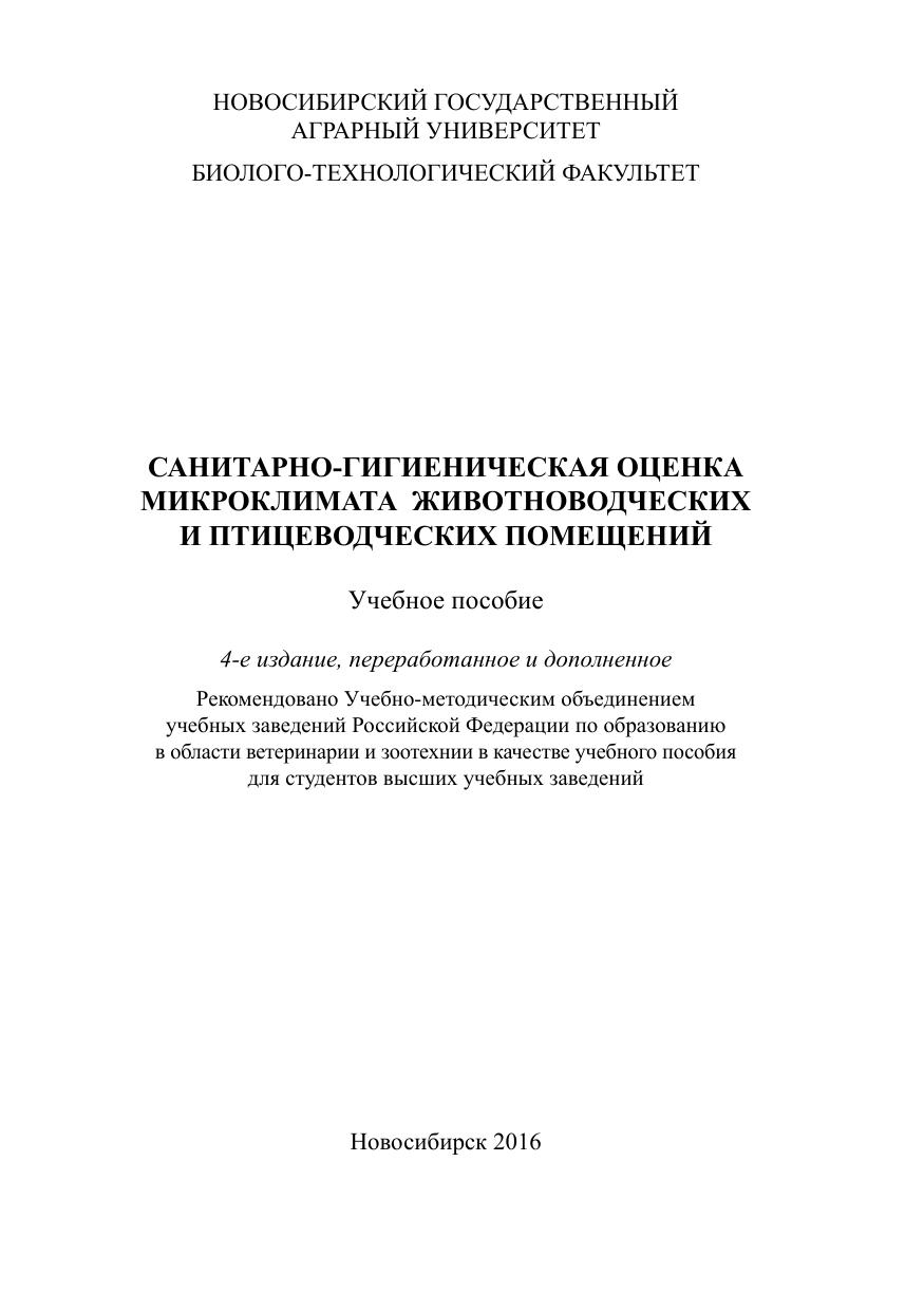 Учебное пособие составлено в соответствии с рабочими программами дисциплин «Зоогигиена» и «Гигиена животных». В нем приведены наиболее распространенные методы санитарно-гигиенической оценки микроклимата, способы расчета объемов искусственной вентиляции и теплового баланса животноводческих и птицеводческих помещений, представлены контрольные задания по изучаемым разделам, приведены основные термины и приложения, а также список рекомендуемой литературы. Учебное пособие предназначено для студентов очной и заочной форм обучения, обучающихся по направлениям подготовки 36.03.02 – Зоотехния, 35.03.07 – Технология производства и переработки сельскохозяйственной продукции, специальности 36.05.01 – Ветеринария, а также руководителей и специалистов предприятий сельского хозяйства всех форм собственности, научных работников, аспирантов, слушателей ФПК.