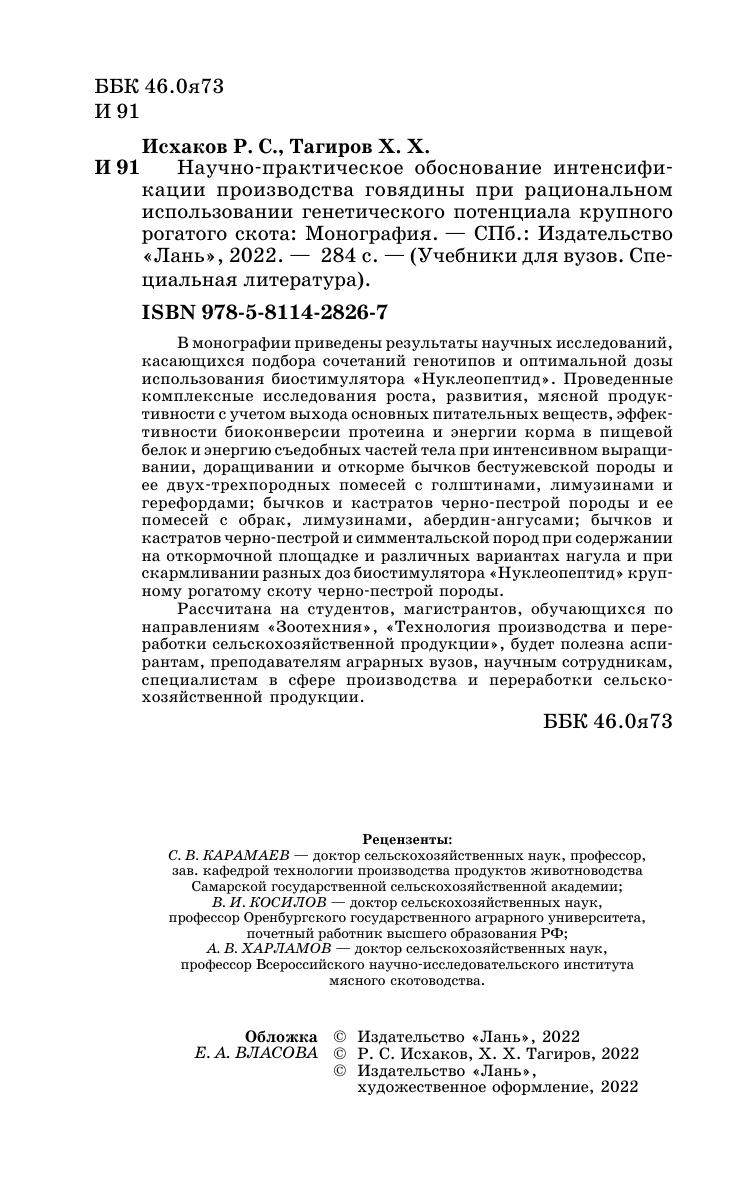 В монографии приведены результаты научных исследований, касающихся подбора сочетаний генотипов и оптимальной дозы использования биостимулятора «Нуклеопептид». Проведенные комплексные исследования роста, развития, мясной продуктивности с учетом выхода основных питательных веществ, эффективности биоконверсии протеина и энергии корма в пищевой белок и энергию съедобных частей тела при интенсивном выращивании, доращивании и откорме бычков бестужевской породы и ее двух-трехпородных помесей с голштинами, лимузинами и герефордами, бычков и кастратов черно-пестрой породы и ее помесей с обрак, лимузинами, абердин-ангусами, бычков и кастратов черно-пестрой и симментальской пород при содержании на откормочной площадке и различных вариантах нагула и при скармливании разных доз биостимулятора «Нуклеопептид» крупному рогатому скоту черно-пестрой породы. Рассчитана на студентов, магистрантов, обучающихся по направлениям «Зоотехния», «Технология производства и переработки сельскохозяйственной продукции», будет полезна аспирантам, преподавателям аграрных вузов, научным сотрудникам, специалистам в сфере производства и переработки сельскохозяйственной продукции.