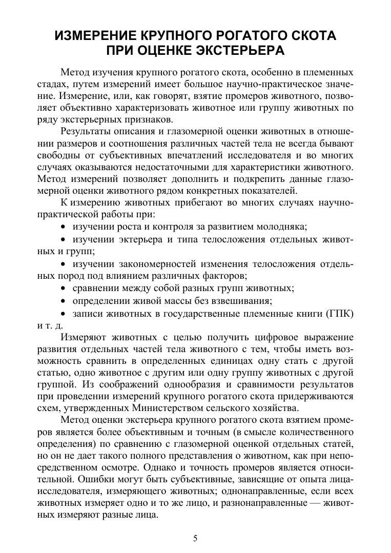 В учебном пособии подробно представлен комплексный материал по организации и проведению измерения крупного рогатого скота. Показана методика взятия основных промеров тела, порядок расчета индексов телосложения, построения экстерьерного профиля. Помимо измерения тела животных обращено внимание на промеры вымени, рогов, семенников, копыт, кожи. Особое место в брошюре отведено на практическое использование результатов промеров тела в селекционно-племенной работе в скотоводстве.