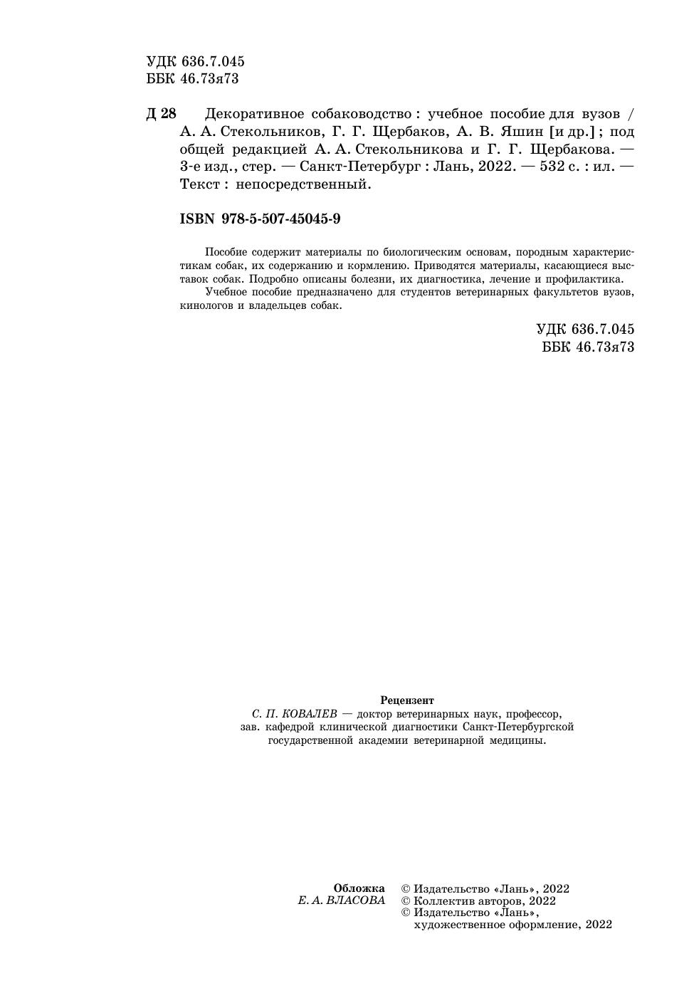 Пособие содержит материалы по биологическим основам, породным характеристикам собак, их содержанию и кормлению. Приводятся материалы, касающиеся выставок собак. Подробно описаны болезни, их диагностика, лечение и профилактика. Учебное пособие предназначено для студентов ветеринарных факультетов, кинологов и владельцев собак.