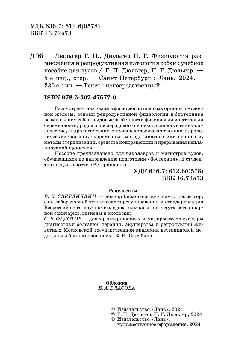 Рассмотрены анатомия и физиология органов половых органов и молочной железы, основы репродуктивной физиологии и биотехника размножения собак, видовые особенности физиологии и патология беременности, родов и послеродового периода, основные гинекологические, андрологические, онкогинекологические и онкоандрологические болезни, современные методы диагностики щенности, методы стерилизации, средства контрацепции и прерывания непланируемой щенности. Пособие предназначено для студентов аграрных вузов, обучающихся по направлению подготовки «Зоотехния» и специальности «Ветеринария».