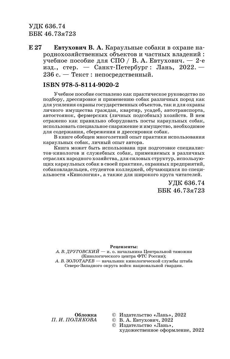 Книга может быть использована при подготовке специалистов-кинологов и служебных собак, применяемых в различных отраслях народного хозяйства, для силовых структур, использующих караульных собак в своей практике, охранных предприятий, собаковладельцев, студентов колледжей обучающихся по специальности «Кинология», а также для широкого круга читателей.