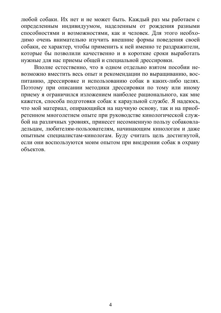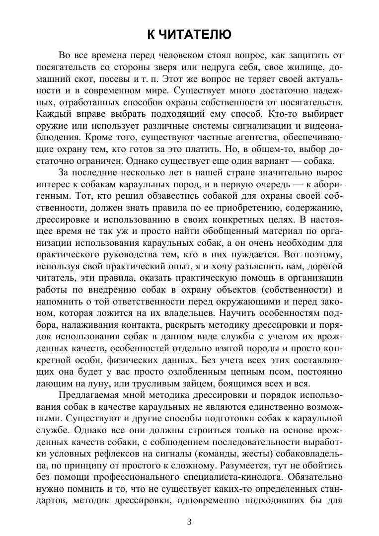 Учебное пособие составлено как практическое руководство по подбору, дрессировке и применению собак различных пород, как для усиления охраны государственных объектов, так и для охраны личного имущества граждан, квартир, усадеб, автотранспорта, автостоянок, фермерских (личных подсобных) хозяйств. В нем отражено как правильно оборудовать посты караульных собак, использовать специальное снаряжение и имущество необходимое для содержания, сбережения и дрессировки собак.