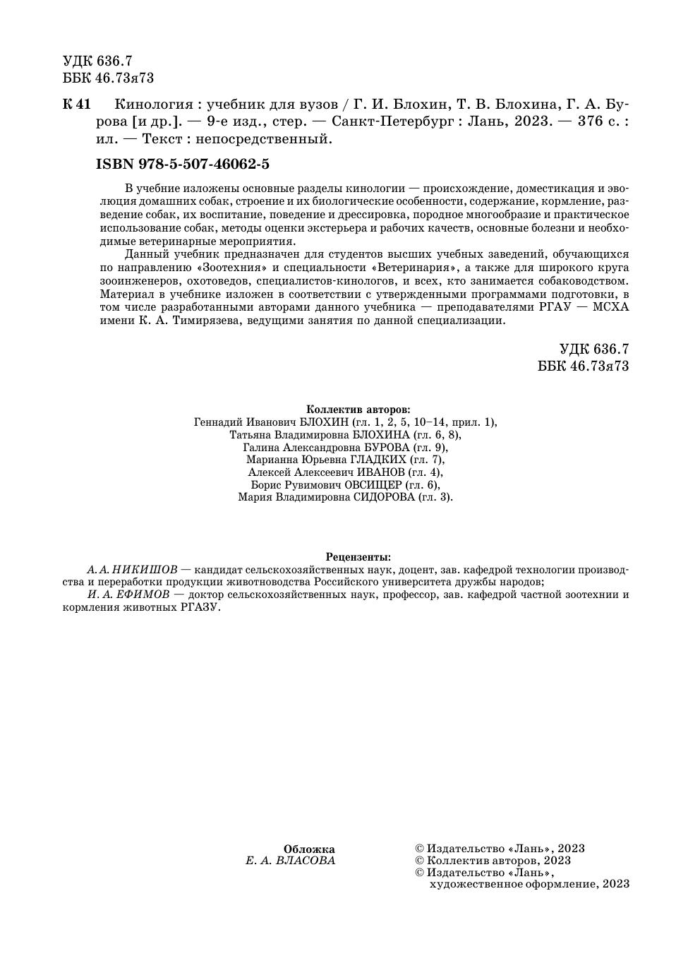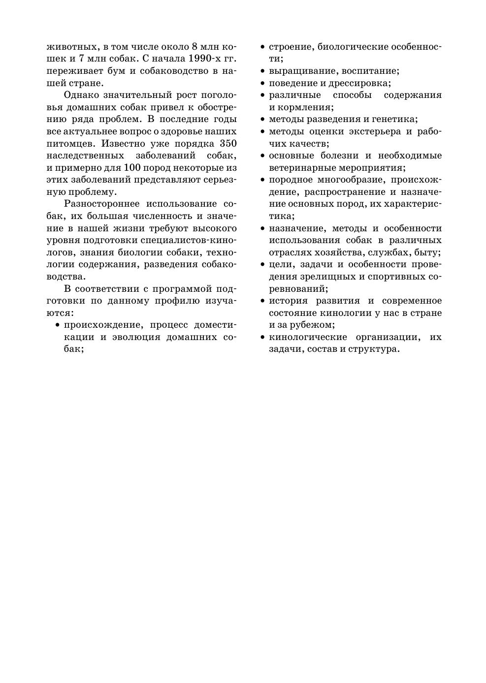 Изложены основные разделы кинологии — происхождение, доместикация и эволюция домашних собак, строение и их биологические особенности, содержание, кормление, разведение собак, их воспитание, поведение и дрессировка, породное многообразие и практическое использование собак, методы оценки экстерьера и рабочих качеств, основные болезни и необходимые ветеринарные мероприятия. Данный ученик предназначен для студентов высших учебных заведений, обучающихся по направлению «Зоотехния» и специальности «Ветеринария», а также для широкого круга зооинженеров, охотоведов, специалистов-кинологов, всех, кто занимается собаководством. Материал в учебнике изложен в соответствии с утвержденными программами подготовки, в том числе разработанными авторами данного учебника — преподавателями РГАУ-МСХА имени К. А. Тимирязева, ведущими занятия по данной специализации.