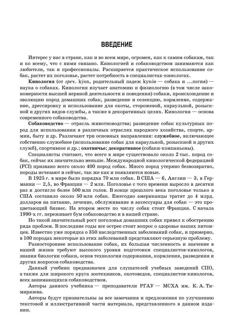 В данном учебнике изложены основные разделы кинологии — происхождение, доместикация и эволюция домашних собак, строение и их биологические особенности, содержание, кормление, разведение собак, их воспитание, поведение и дрессировка, породное многообразие и практическое использование собак, методы оценки экстерьера и рабочих качеств, основные заболевания и необходимые ветеринарные мероприятия. Соответствует современным требованиям Федерального государственного образовательного стандарта среднего профессионального образования и профессиональным квалификационным требованиям. Данный учебник предназначен для студентов колледжей и техникумов, обучающихся по специальности «Кинология», а также для широкого круга кинологов, всех занимающихся собаководством. Материал изложен в соответствии с программами подготовки.